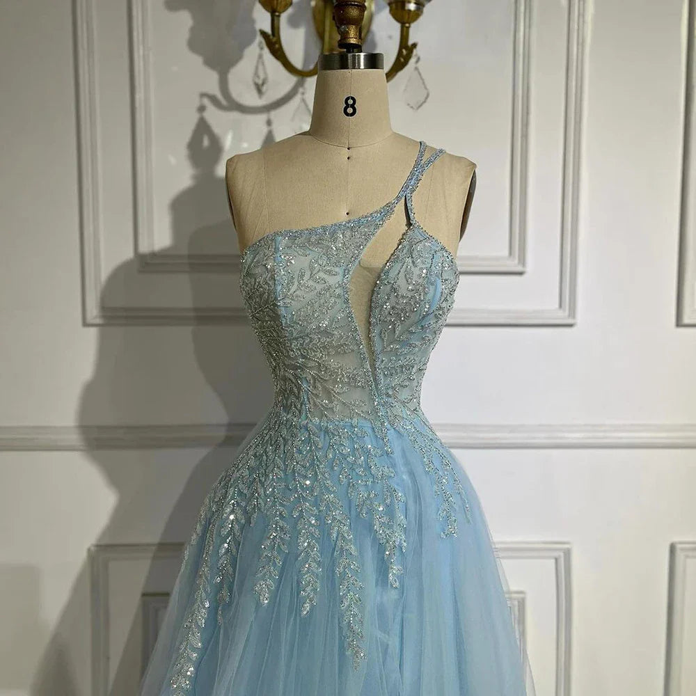 Arabic Blue Spaghetti Strap A Line One Shoulder Beaded Luxury Evening Dresses Gowns for Women's Party 2025 LA72589