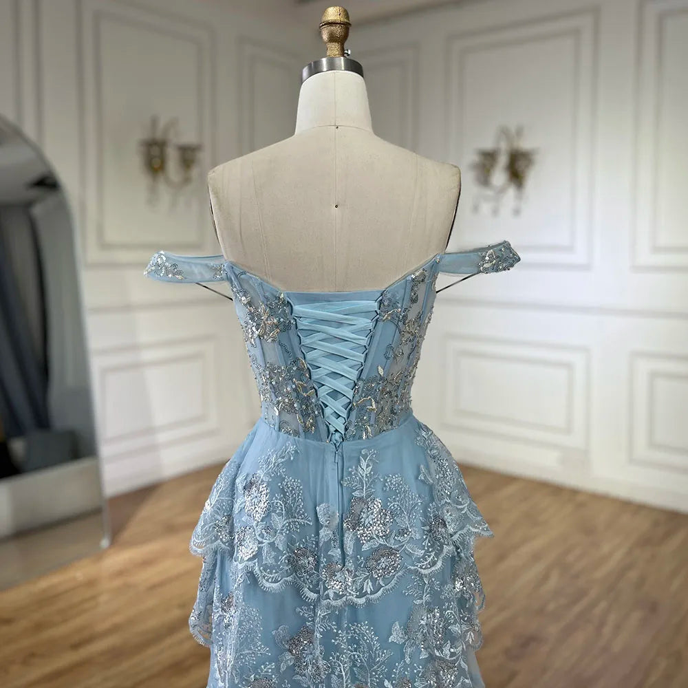 Arabic Blue Spaghetti Strap Tiered Beaded Evening Gown with Front Split for Women - Wedding Party 2025 LA72593