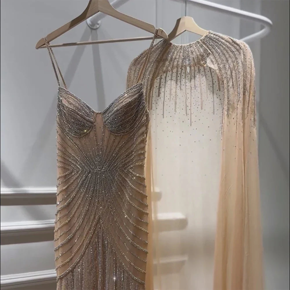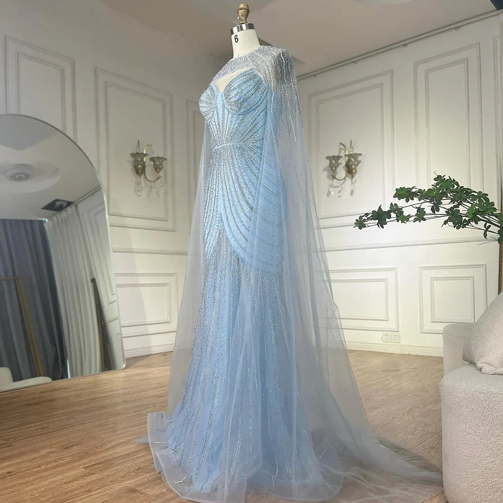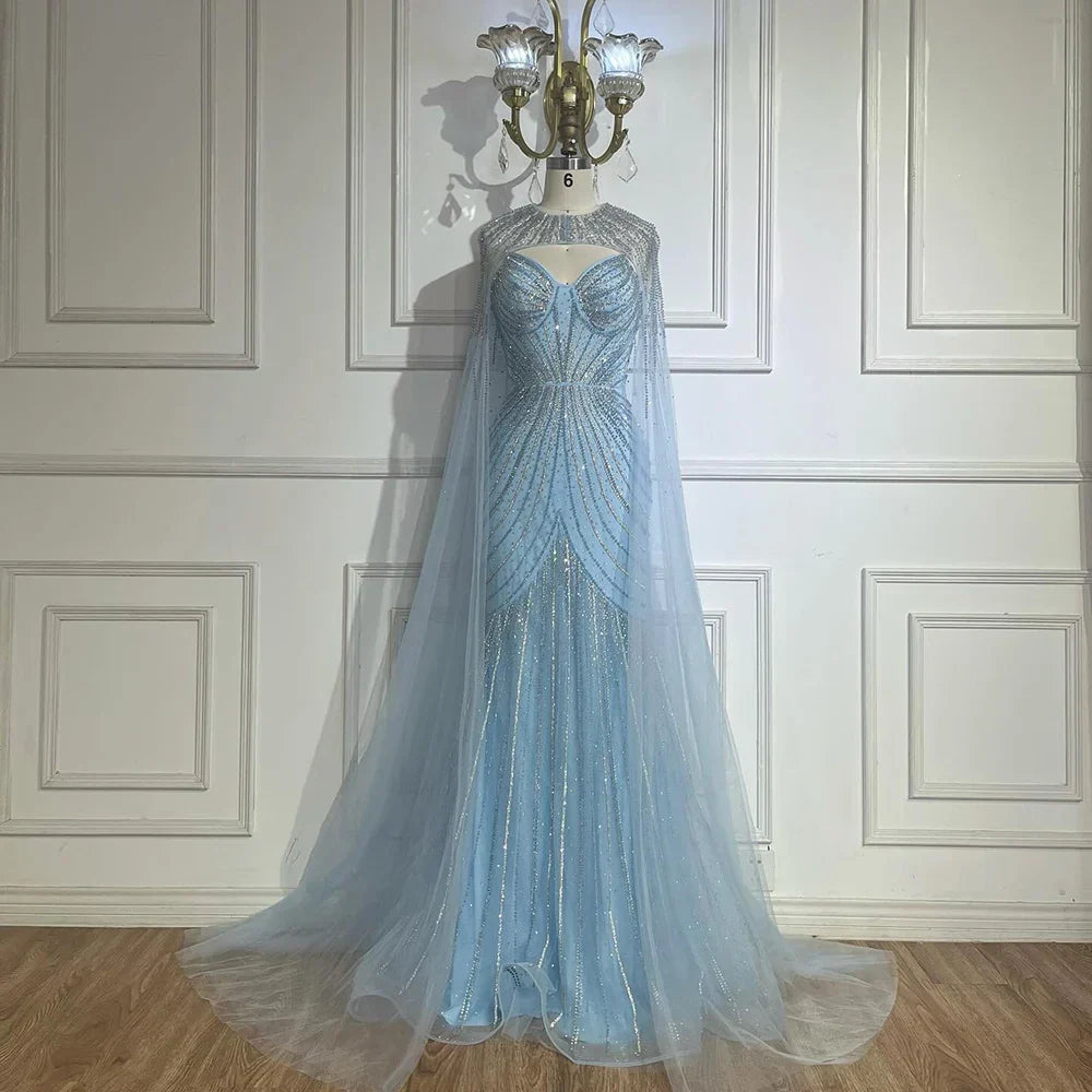 Arabic Blue Spaghetti Straps Beaded Evening Gown with Detachable Cape Dress for Formal Occasion 2025 LA72784