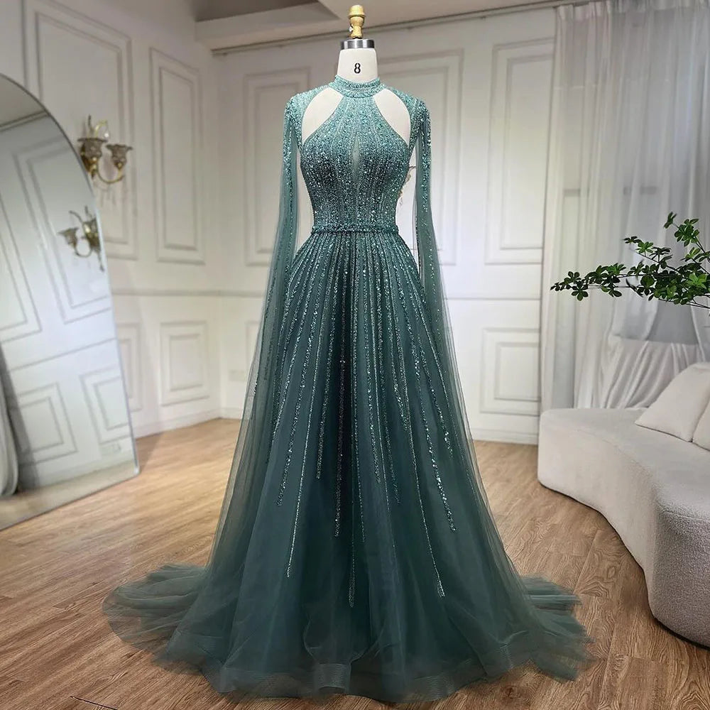 Arabic Fuchsia A Line Cape Sleeve Beaded Luxury Dubai Evening Dresses Gowns For Women Wedding Party 2025 LA72306