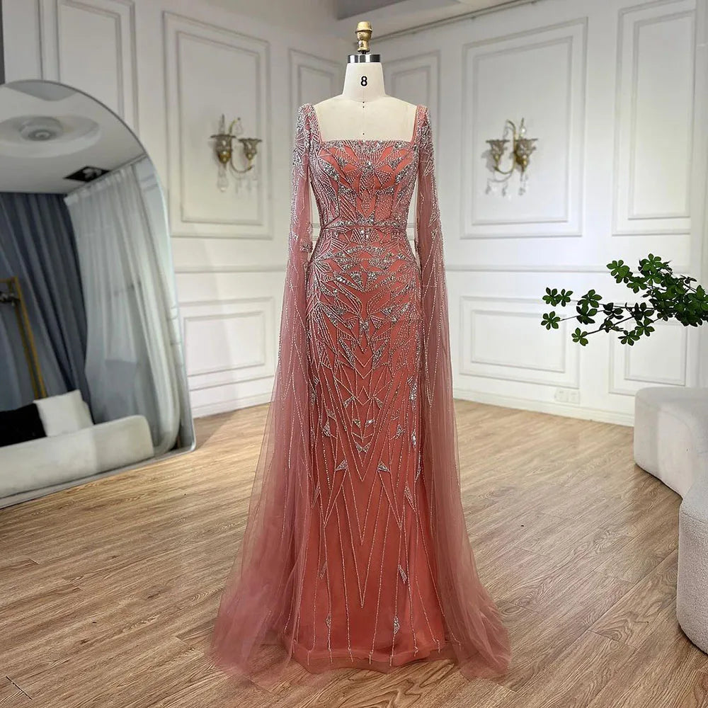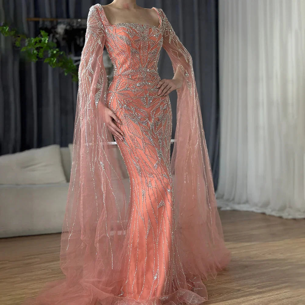 The luxurious Saudi Arabic design features a square collar and elegant cape sleeves. perfect for any wedding party. Make a statement with our haute couture gown. adding a touch of glamour to your special day.