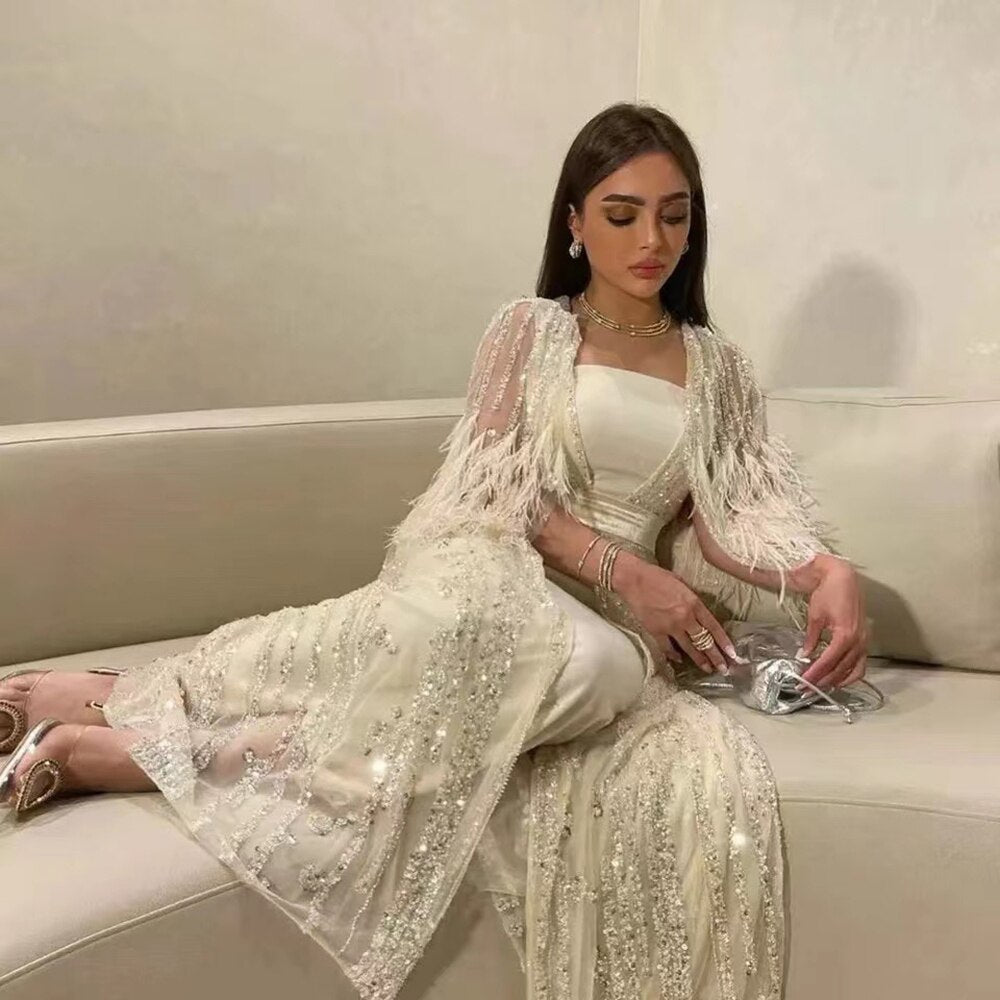 Beaded Feathers A Line Cream Caftan Marocain Femme Evening Dresses Arabic With Jacket Gown For Party LA71759