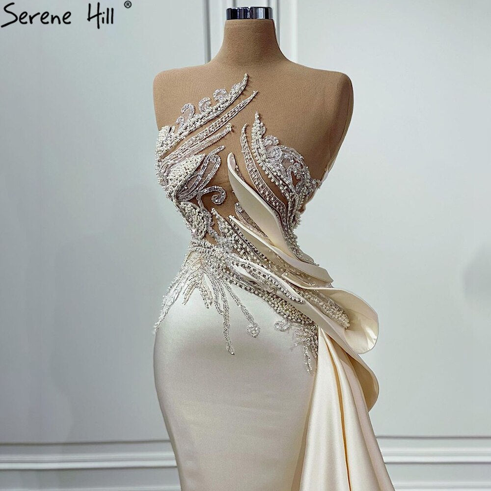Beige Mermaid Overskirt Evening Dresses Gowns 2025 Satin Beaded Elegant For Women Party LA71199