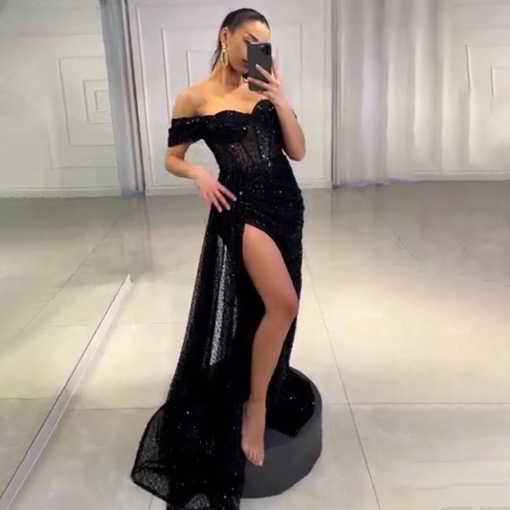 Black Mermaid High Split Evening Dresses Gowns 2025 Elegant Overskirt For Women Party LA71661