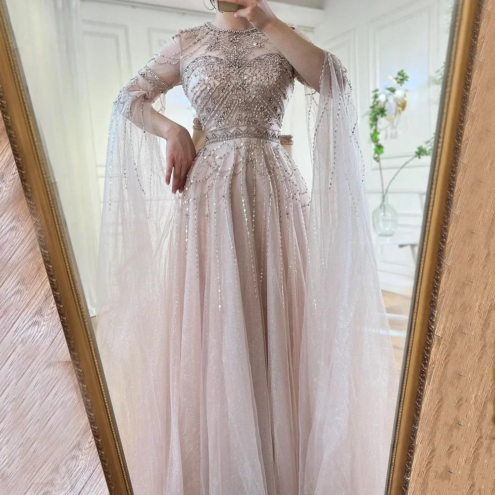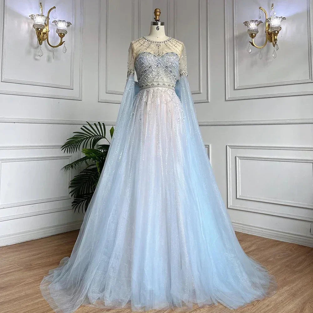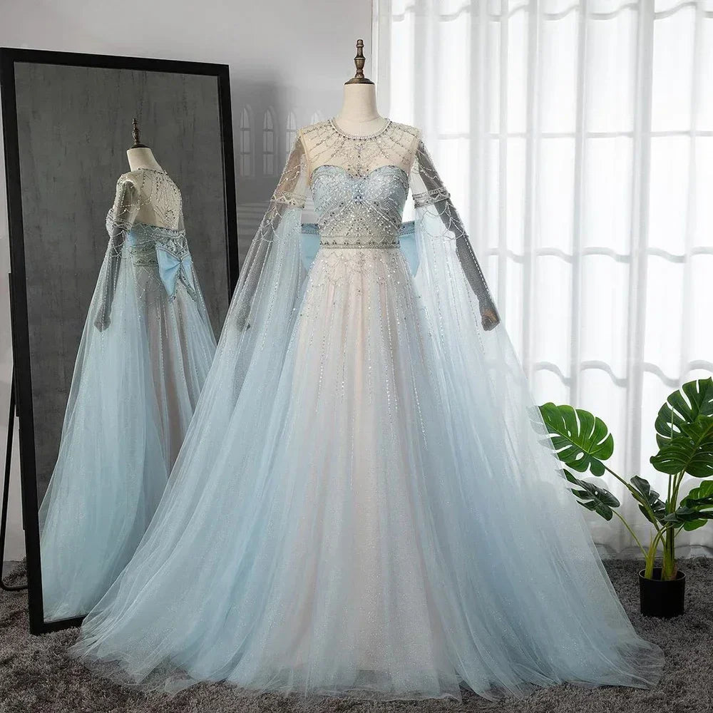 Blue A-Line Arabic Cape Sleeves O-Neck Bow Beaded Luxury Evening Dresses Gowns 2025 For Women Party LA71831