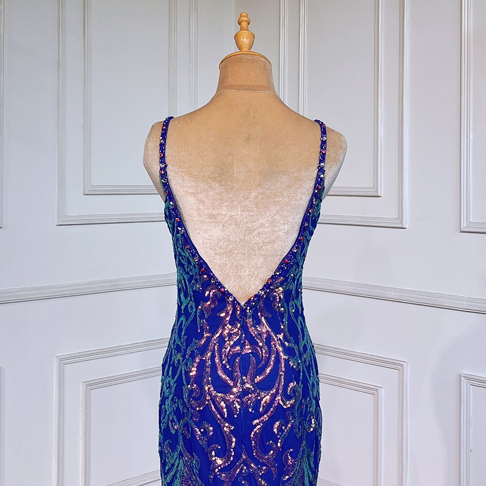 Blue Elegant Mermaid Sexy Backless Spaghetti Straps Beaded Luxury Arabic Evening Dresses Gowns For Women Party LA71791