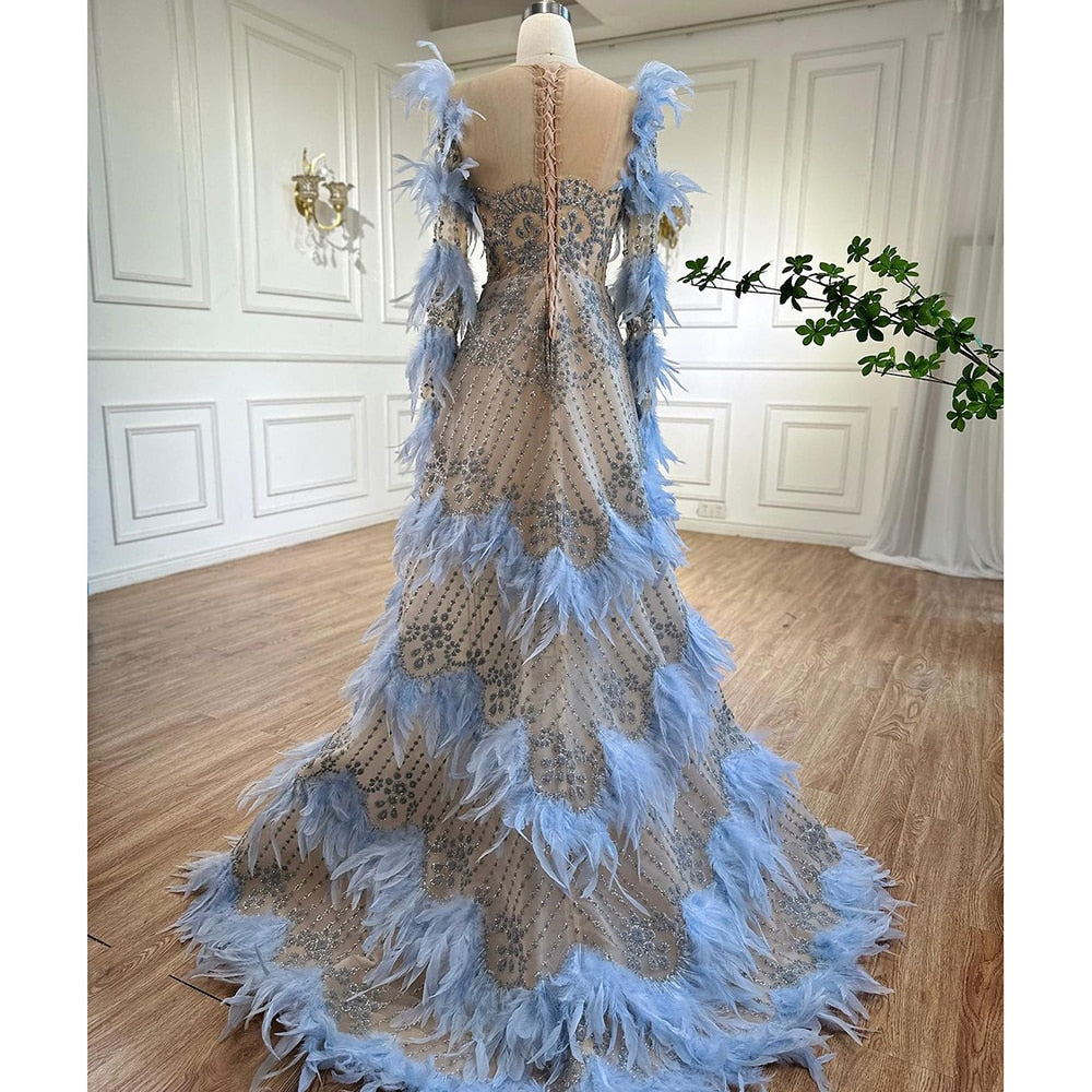 Blue Feathers Luxury Beaded A Line Long Sleeves Elegant Evening Dress 2025 For Women Formal Party Gown LA71816