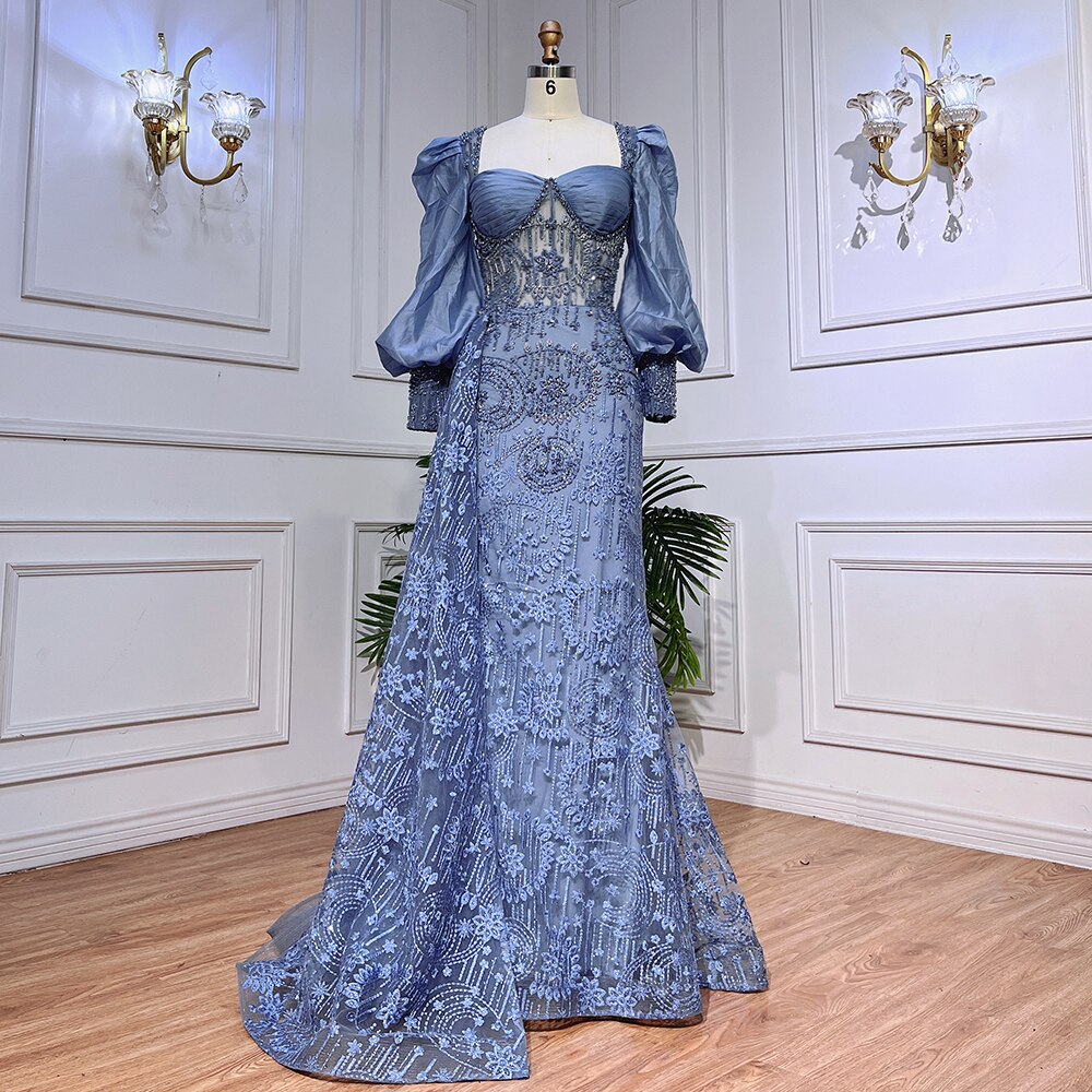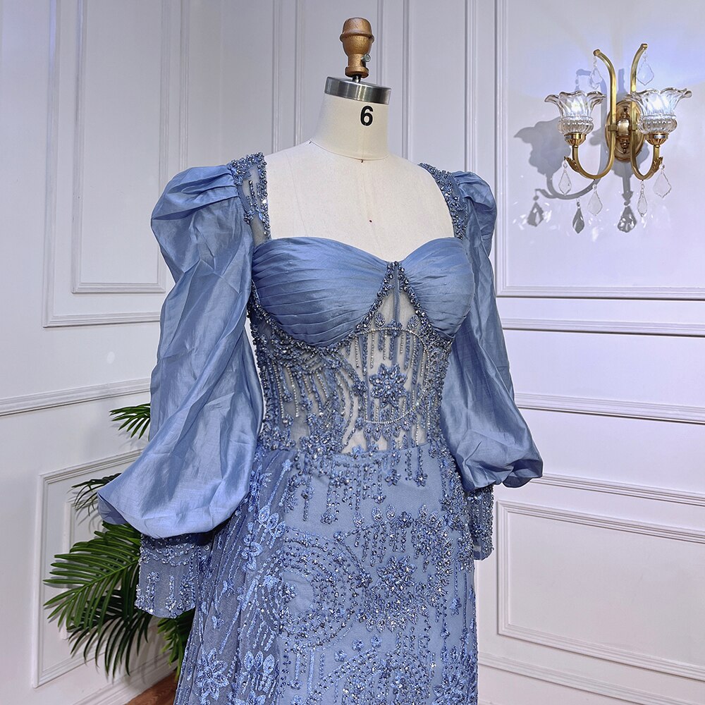 Blue Mermaid Lace Beaded Formal Evening Dresses With Balloon Sleeves For Woman Wedding Party Gowns LA72034