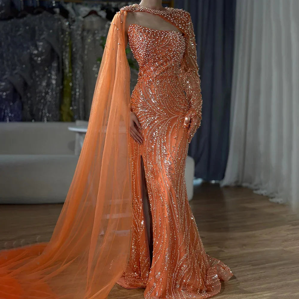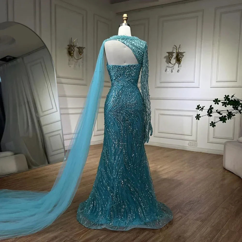 Blue Mermaid Long Cloak High Split Beaded Pearls Luxury Evening Dresses Gowns For Women Wedding Party 2025 LA72268