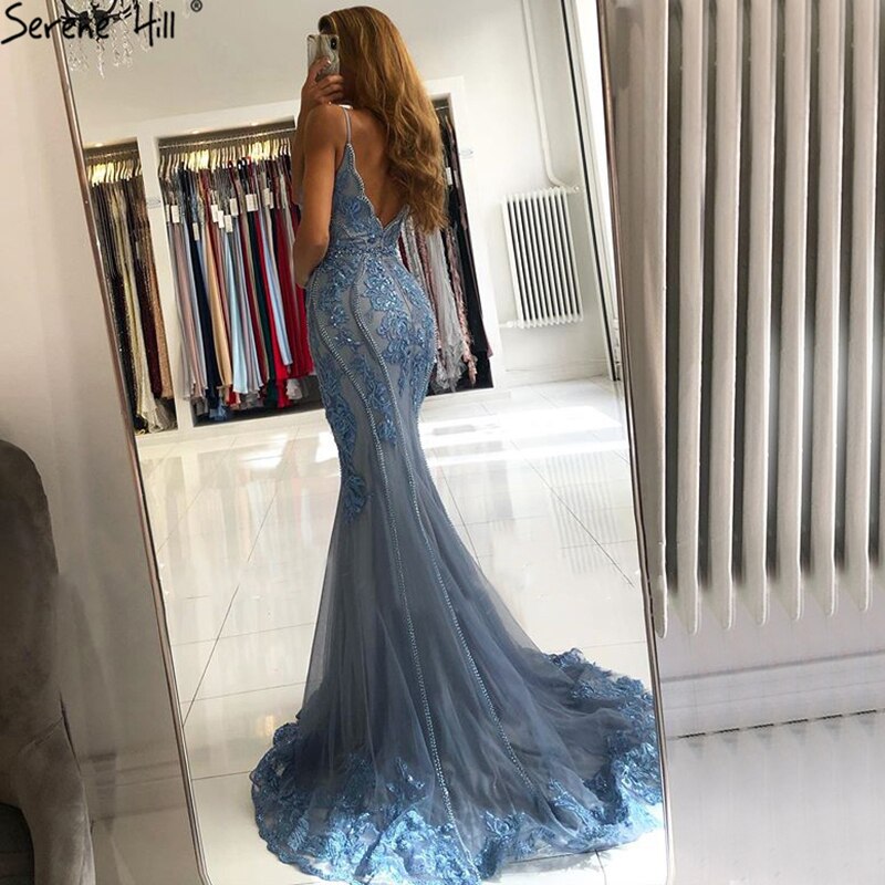 Blue Mermaid Sexy Evening Dresses Sleeveless Beading Lace High-end Formal Dress Design LA70724