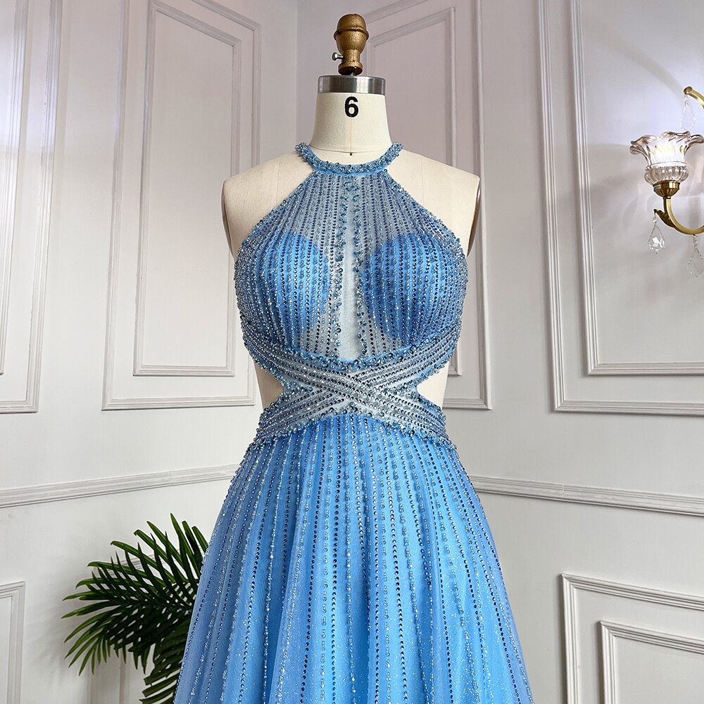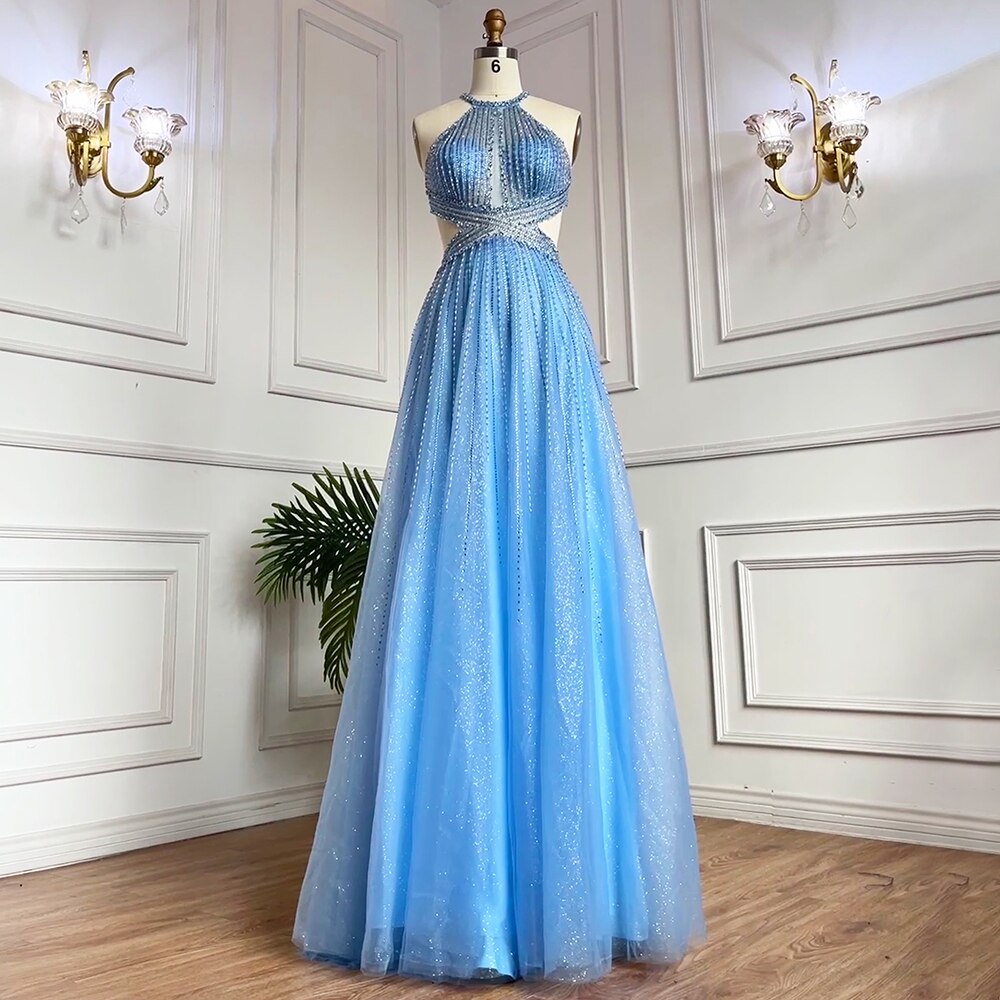 Blue Sexy A-Line 2025 Beaded Halter Graduation School Party Gown Celebrity Prom Dresses LA71882