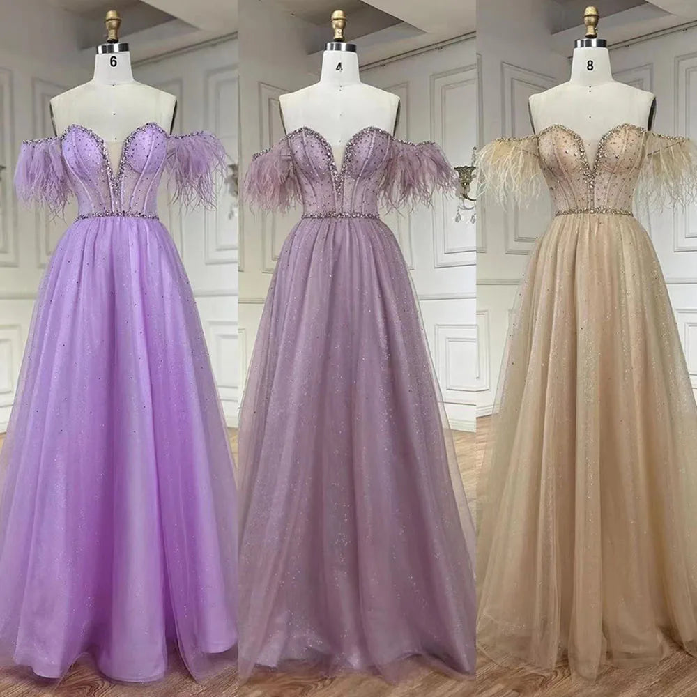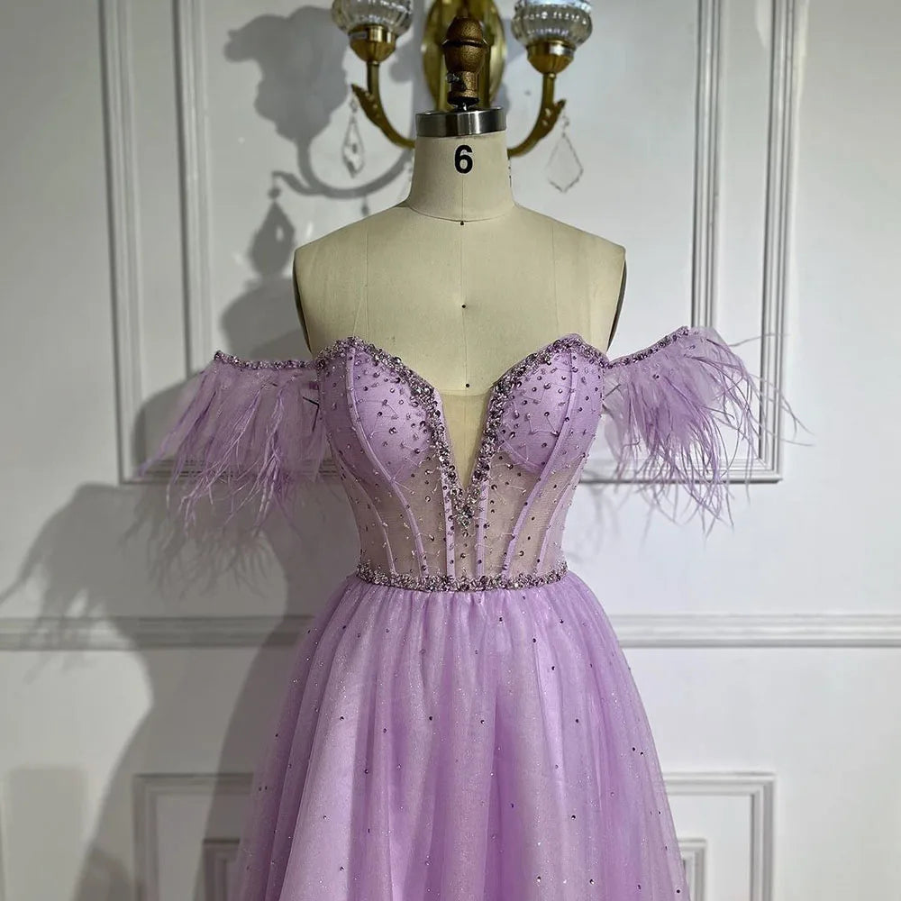 Dubai Arabic Elegant Lilac Feathers Beaded A-Line Evening Gown 2025 Luxury Dress for Women Long Party Dress LA72326
