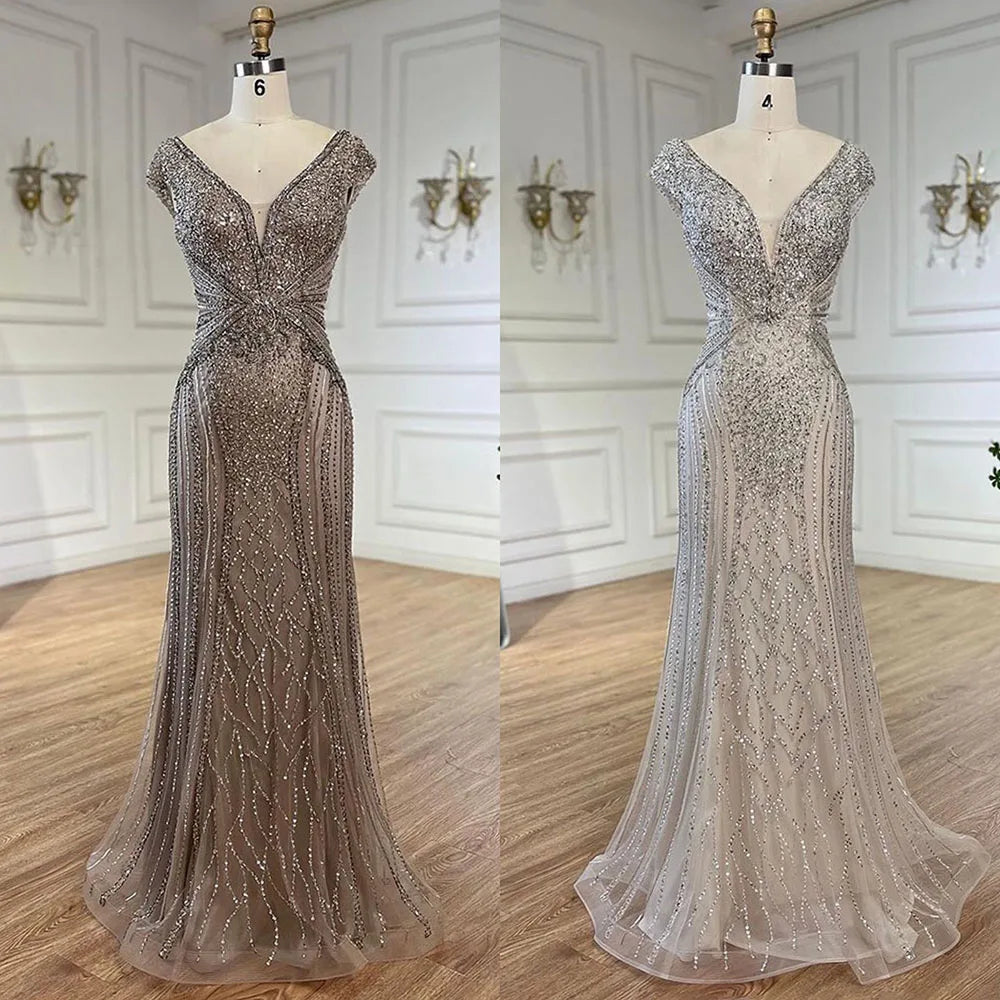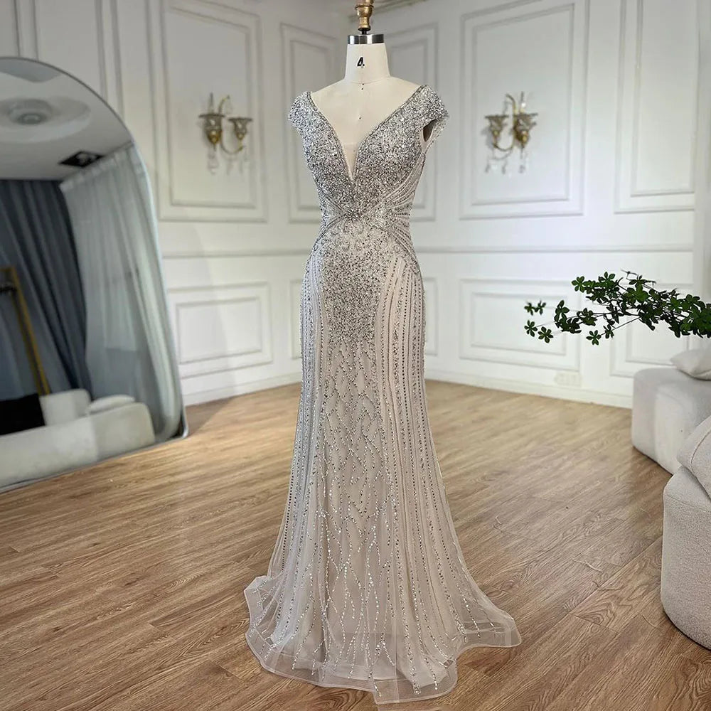 Dubai Beige Elegant Sleeveles Mermaid Beaded Arabic Evening Dresses Gowns for Women Wedding Party 2025 LA72456