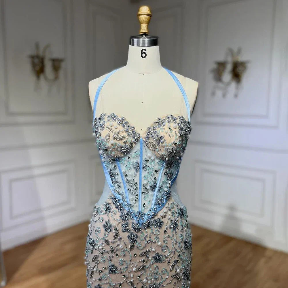 Dubai Blue Mermaid Luxury Beaded Spaghetti Strap Arabic Evening Dresses Gowns for Women Wedding Party 2025 LA72330