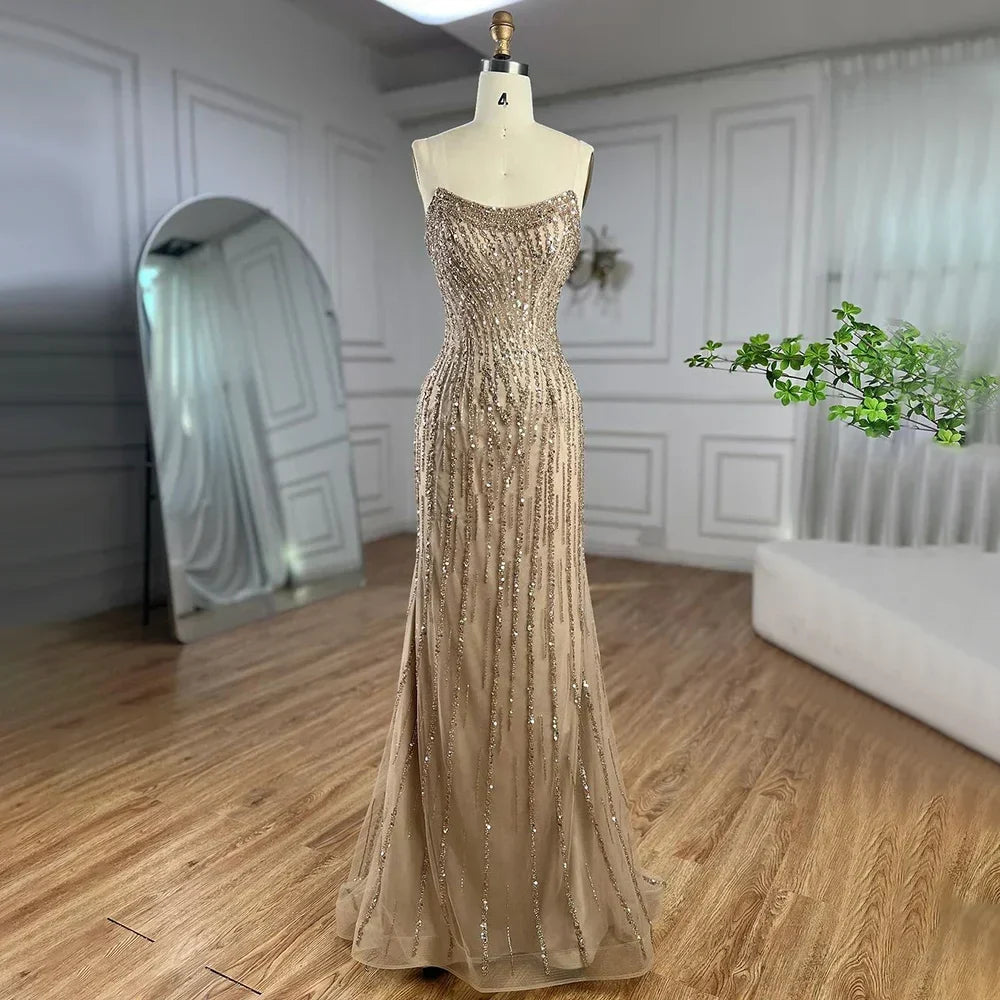 Dubai Caramel Mermaid Long Cloak Beaded Pearls Luxury Evening Dresses Gowns For Women Wedding Party 2025 LA72223