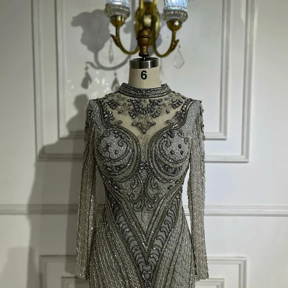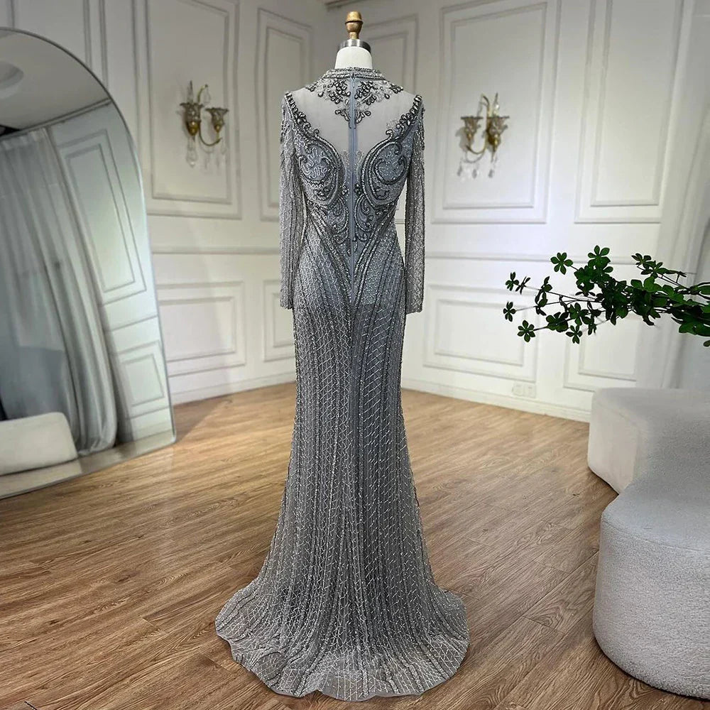 Dubai Gray Mermaid Elegant Lace Crystal Beaded Luxury Evening Dresses Gowns For Women Wedding Party 2025 LA72516
