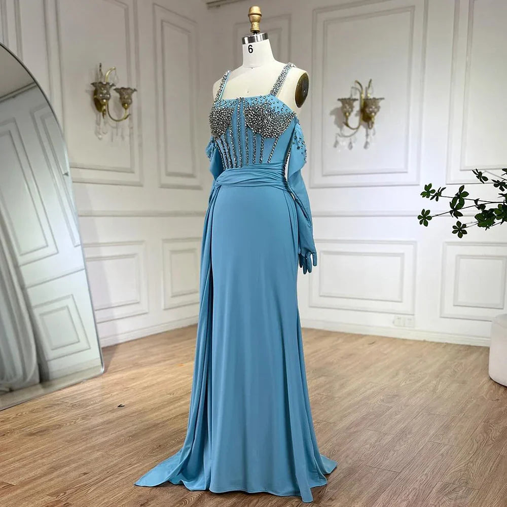Dubai Luxury Evening Gown 2025 Blue High Split Mermaid Spaghetti Strap Gloves Perfect for Wedding Parties LA72366
