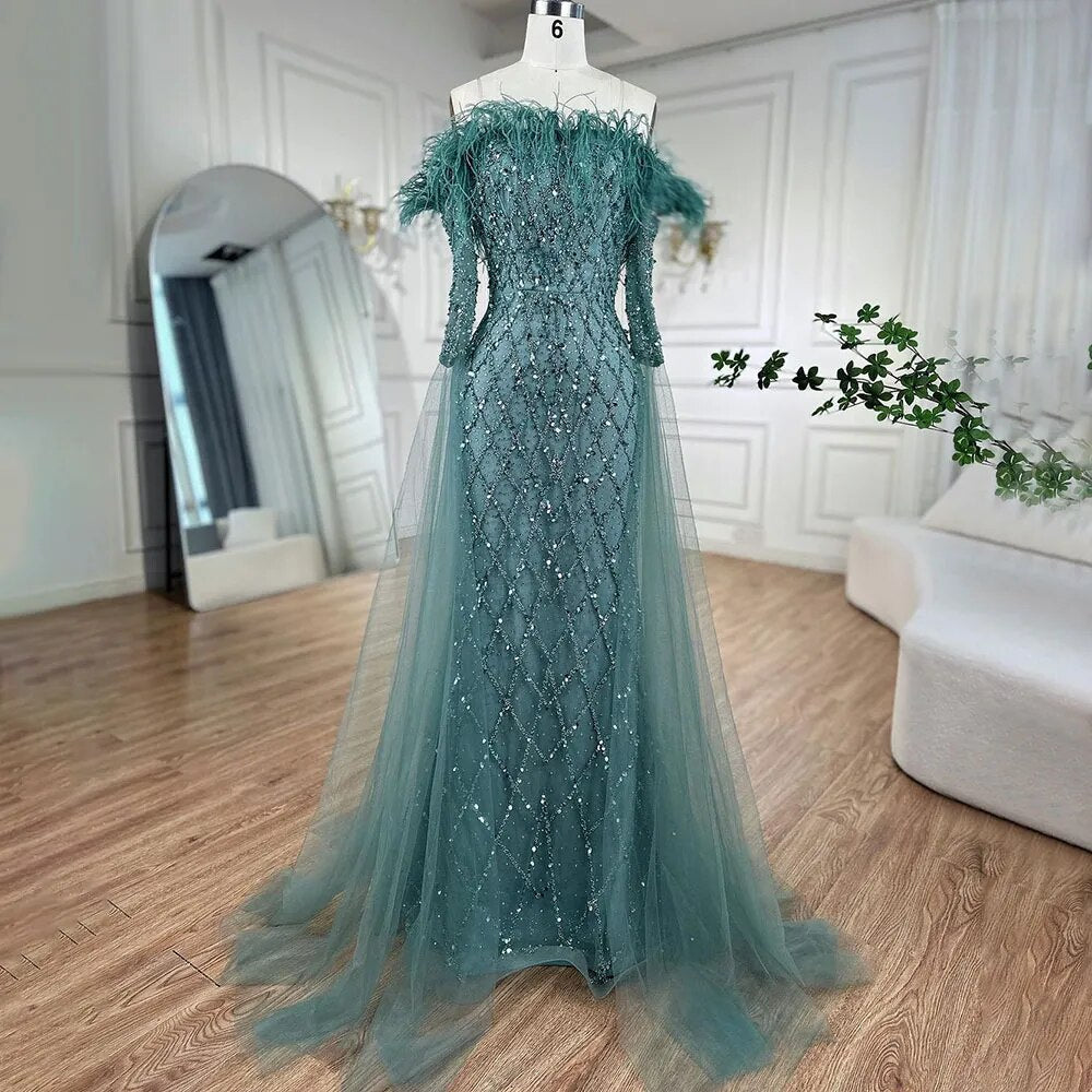 Dubai turquoise Feathers Beaded Mermaid Elegant Strapless Evening Dresses Gowns 2025 For Women Wedding Party LA72169