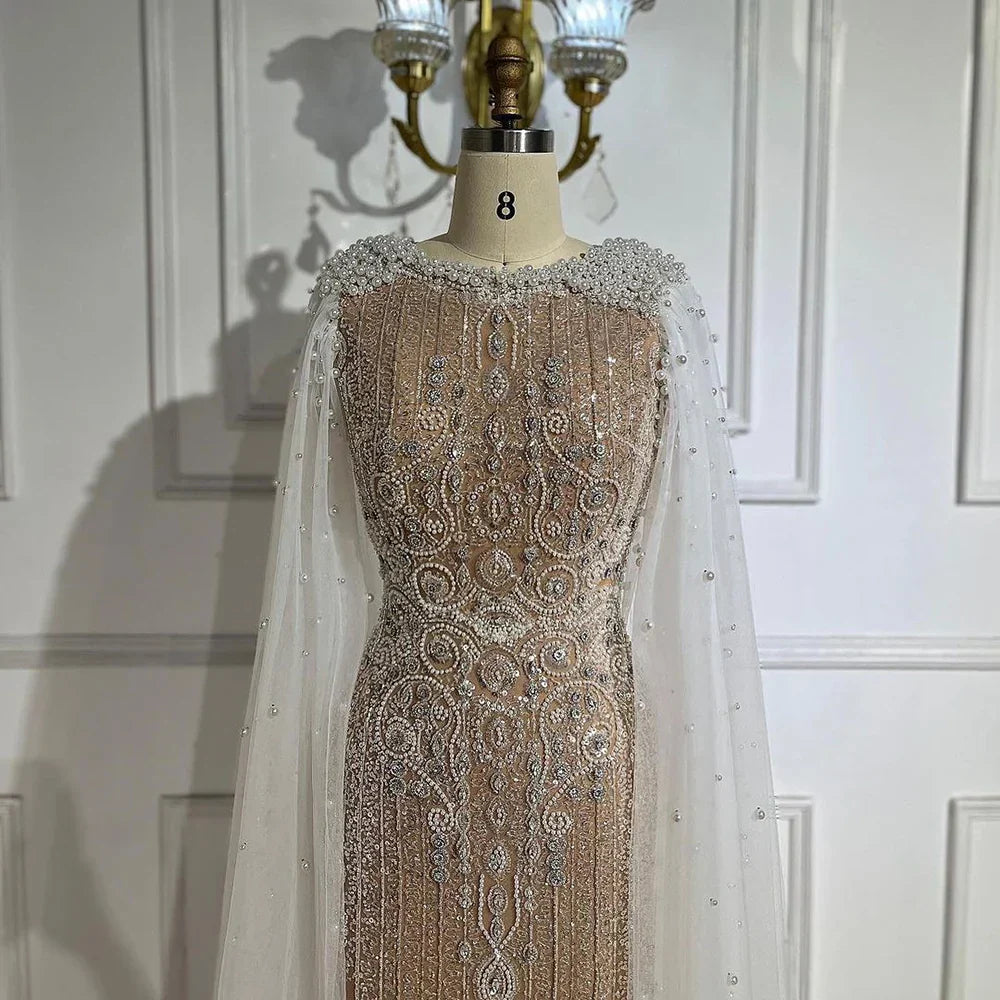 Luxury White Nude Mermaid Evening Dress with Cape Sleeves LA72444
