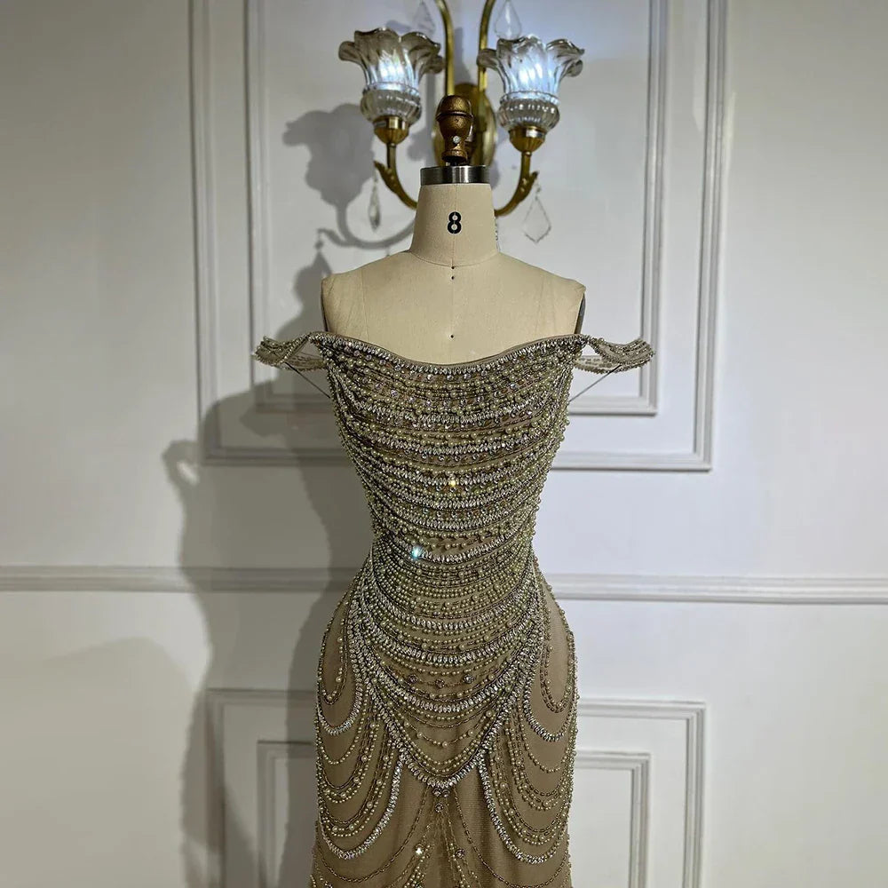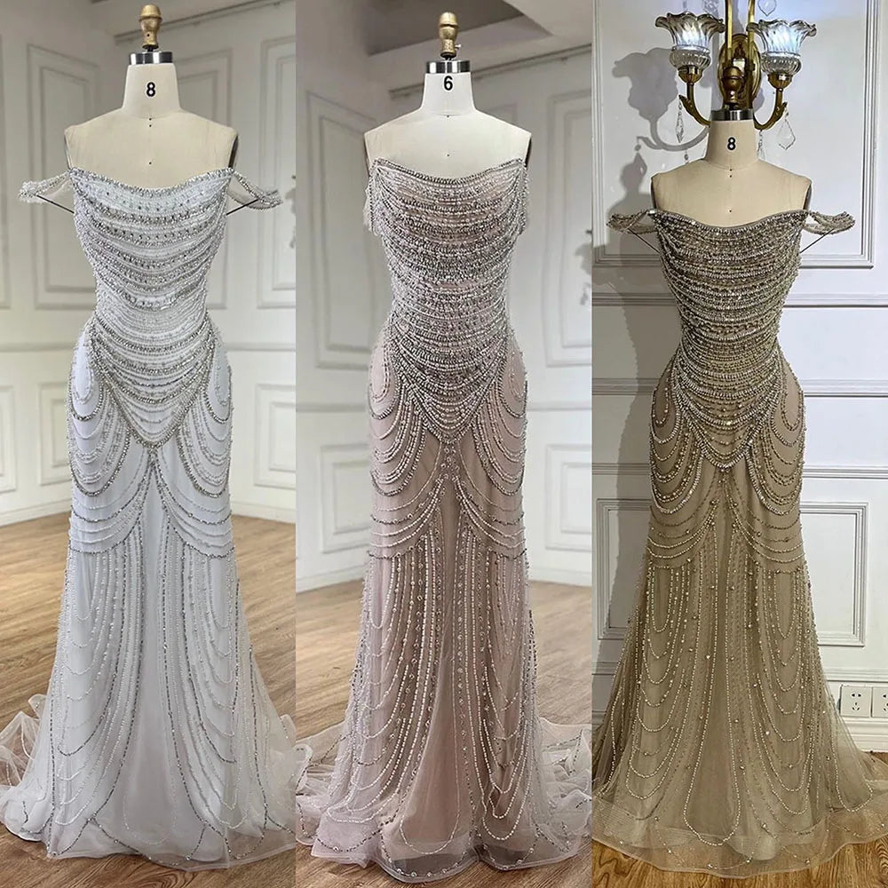 Elevate your evening attire with luxurious Crystal Silver Nude Mermaid Dubai Evening Dresses. This stunning gown features a figure-flattering mermaid silhouette and intricate crystal embellishments. perfect for weddings. proms. and other special occasions.