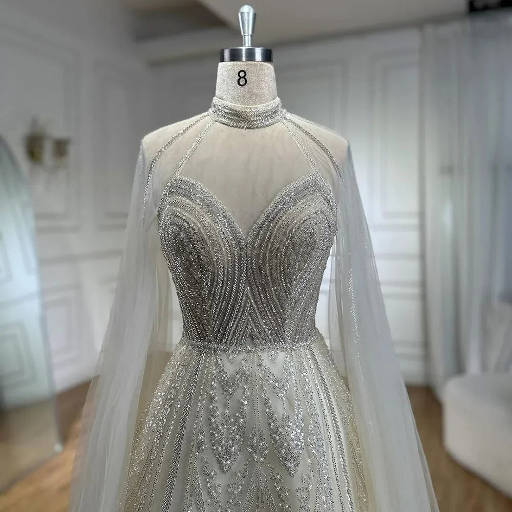 Dubai Yellow Cape Sleeves Elegant A Line Luxury Beaded Evening Dresses Gowns For Women wedding Party 2025 LA72308