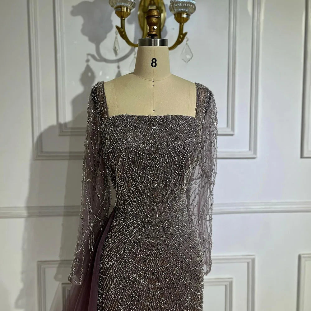 Elegant Arabic Purple Mermaid Beaded Evening Gown with Tulle Overskirt for Women | Wedding Party 2025 LA72032F