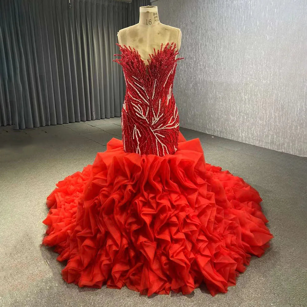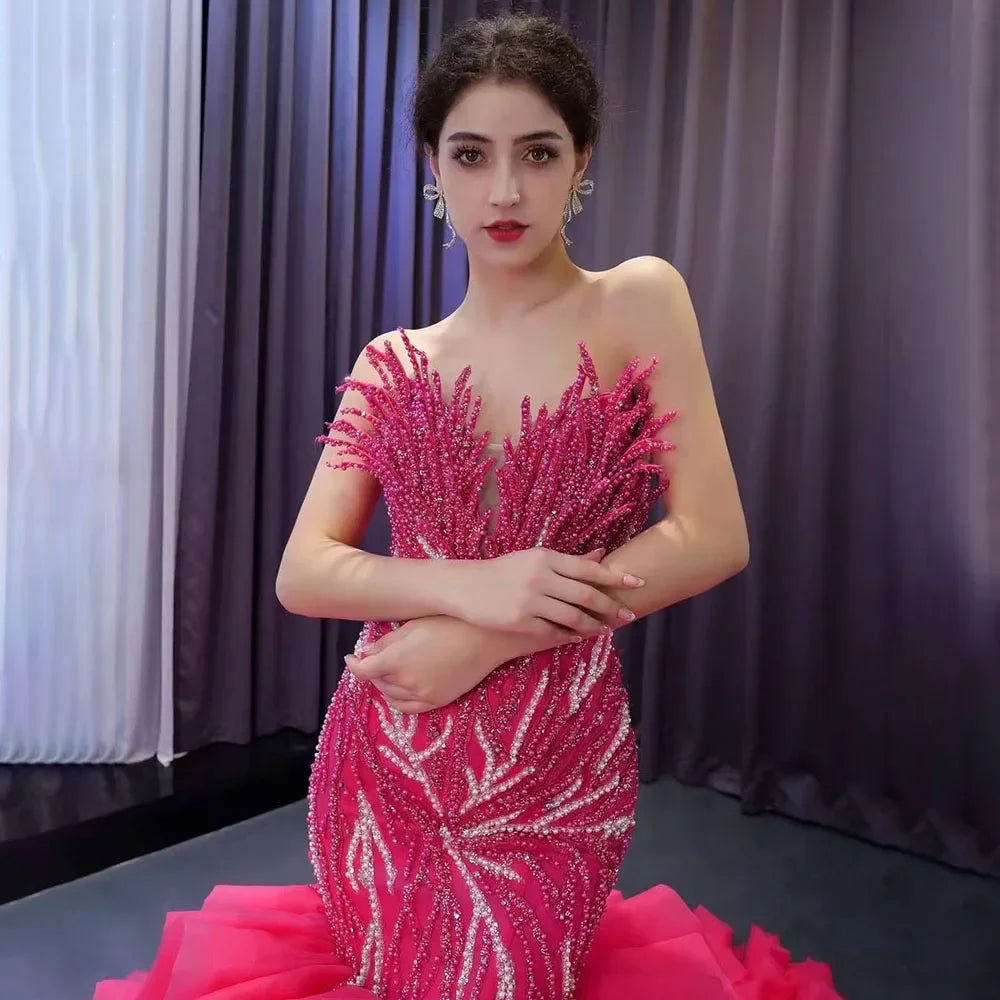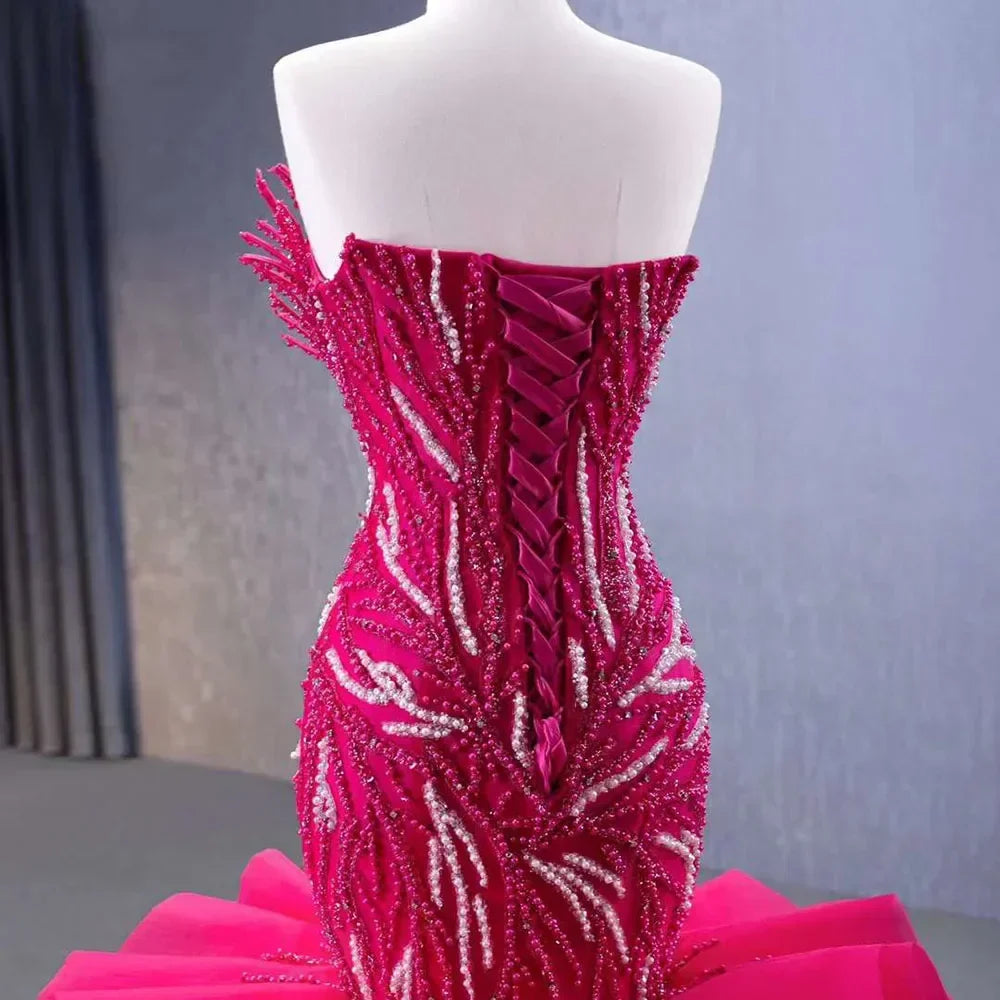 Fuchsia Strapless Lace Up Pearls Beaded Luxury Mermaid Bride Gowns Wedding Dress 2025 High End Custom Made HM231040