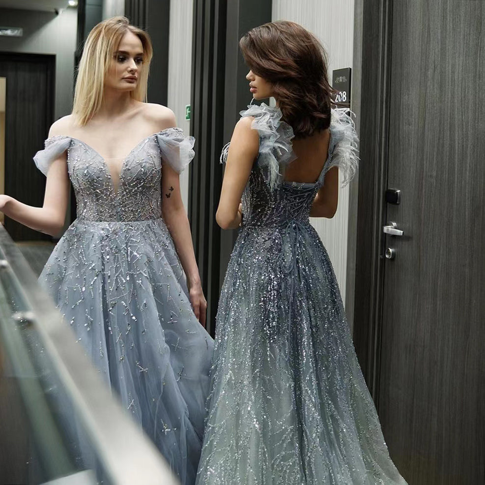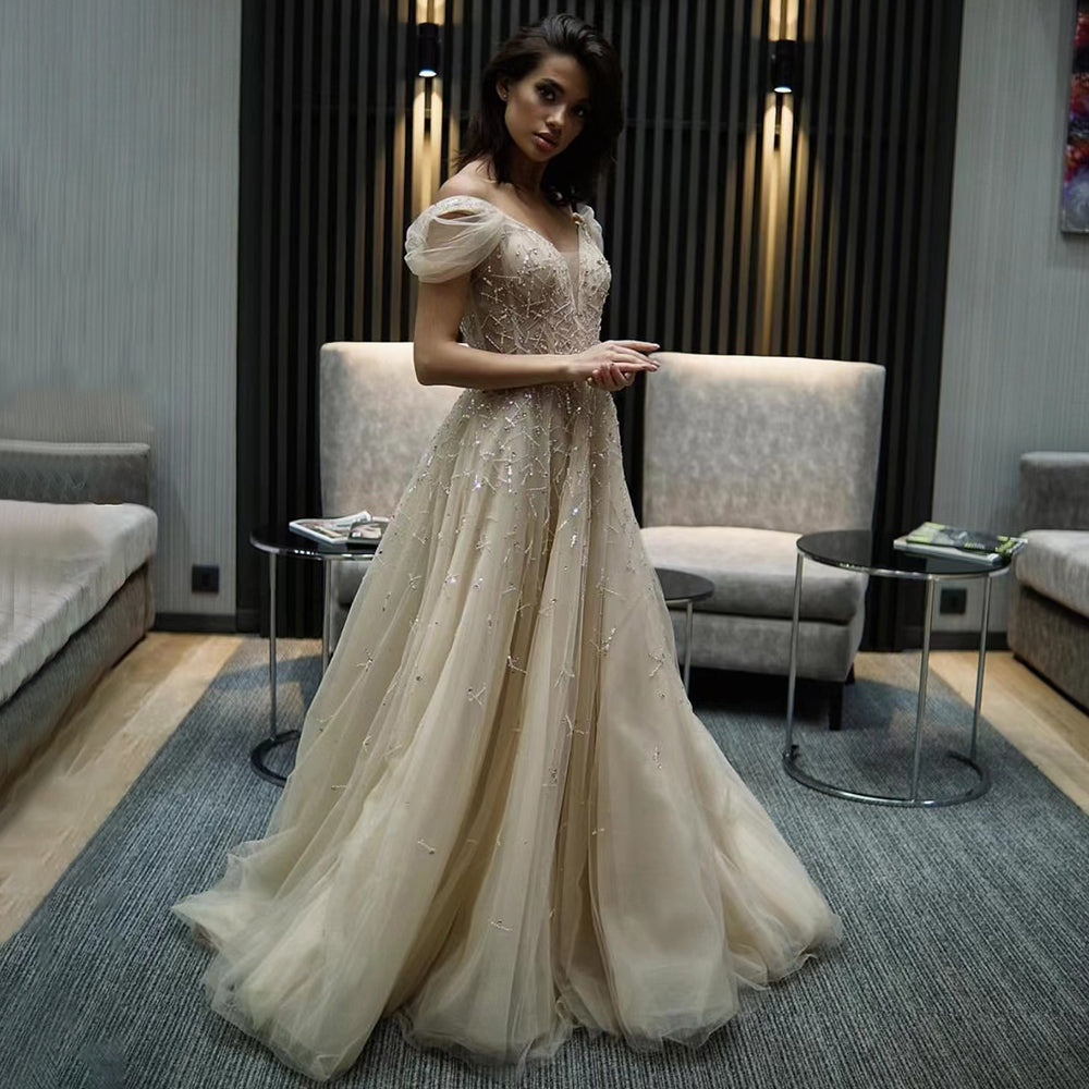 Gold Beaded A-Line Evening Gowns 2025 Off Shoulder Luxury Sexy Dresses Long For Women Party LA71411A