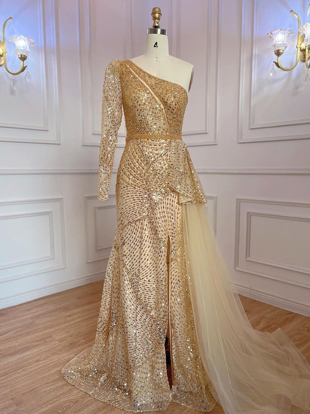 Gold Elegant Mermaid Sexy One Shoulder High Split Beaded Luxury Evening Dresses Gowns For Women Party 2025 LA71890