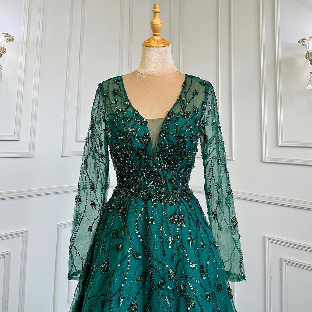 Green A-Line V-Neck Long Sleeves Evening Dresses Gowns Luxury Beaded 2025 For Women Wedding Party LA71702