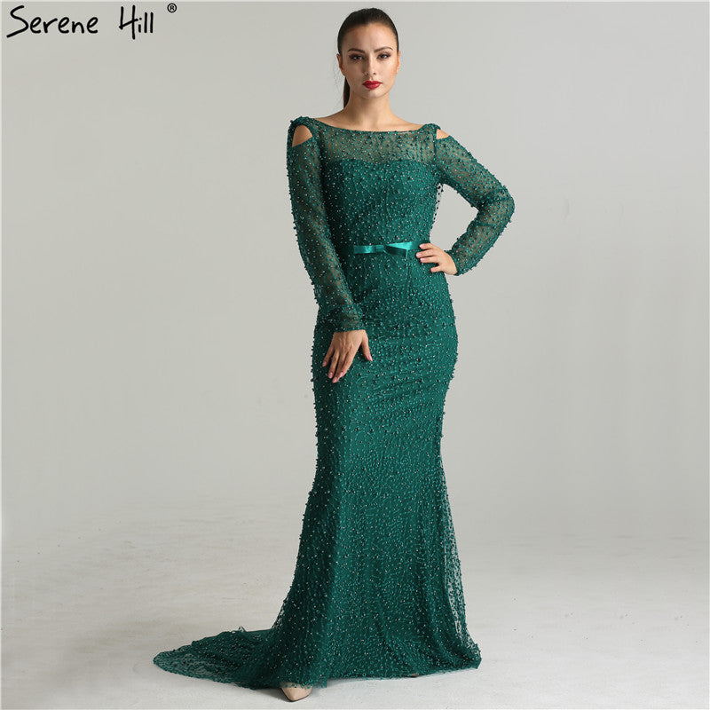 Green Elegant Mermaid Evening Dresses Gowns 2025 Backless Beaded Pearls Luxury For Women Party LA6340