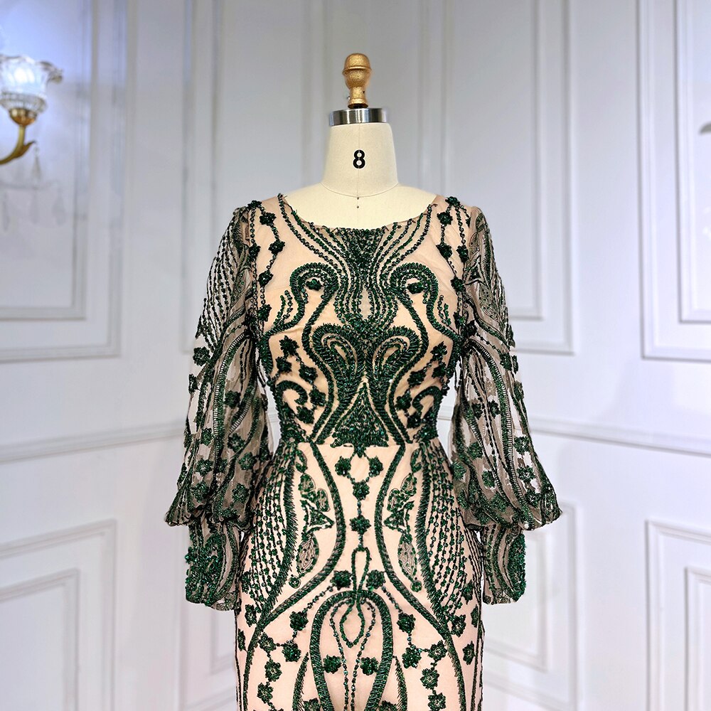 Green Mermaid Elegant Puff Sleeves Lace Beaded Luxury Evening Dresses Gowns For Women Muslim Party 2025 LA71840
