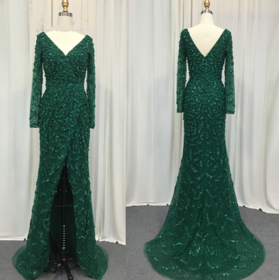Green Mermaid Elegant V-Neck Pearls Long Sleeves Evening Dresses Luxury Beaded 2025 For Women Wedding Party LA70499