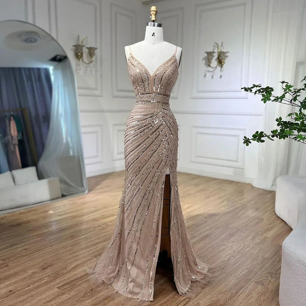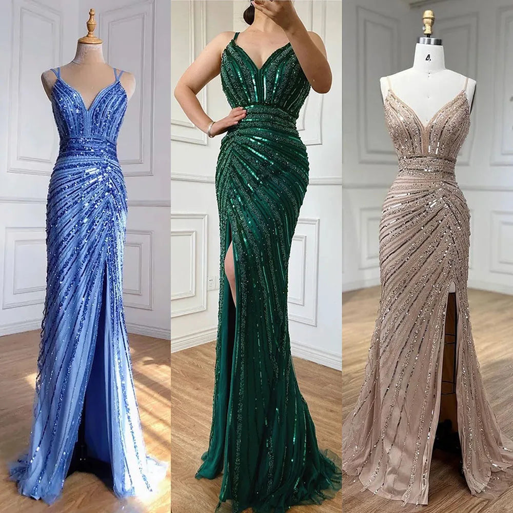 Green Spaghetti Strap Mermaid Evening Dresses Gowns 2025 Beaded Elegant High Split For Women Party LA71235