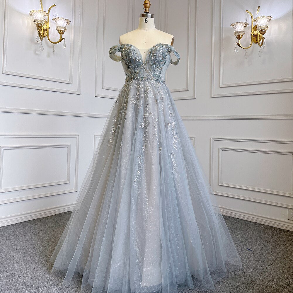 Grey Blue A-Line Sexy Strappy Skirt Cap Sleeve Luxury Beaded Evening Dresses Gowns 2025 For Women Party LA71740