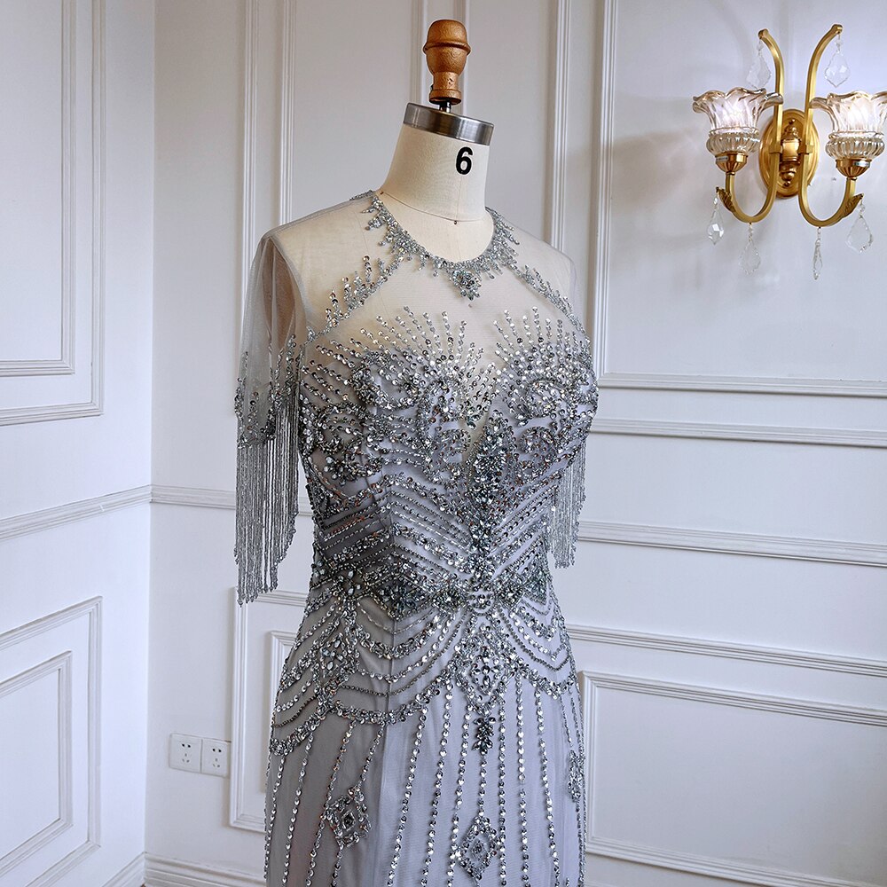 Grey Mermaid O-Neck Short Sleeves Elegant Beaded Luxury Tassel Dubai Evening Dresses Gowns For Women Party 2025 LA70646