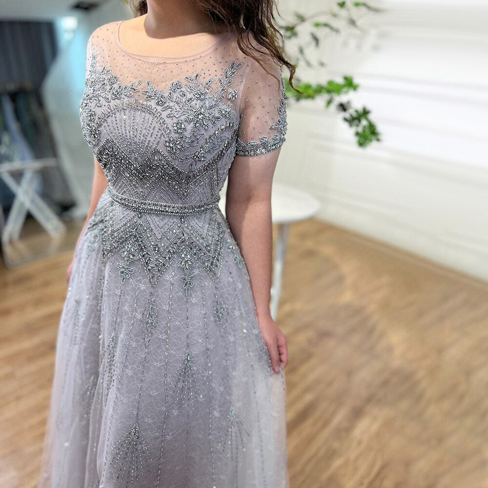 Grey O Neck Short Sleeves A Line Evening Dresses 2025 Mother of the Bride Luxury Beaded Party Gowns LA72102
