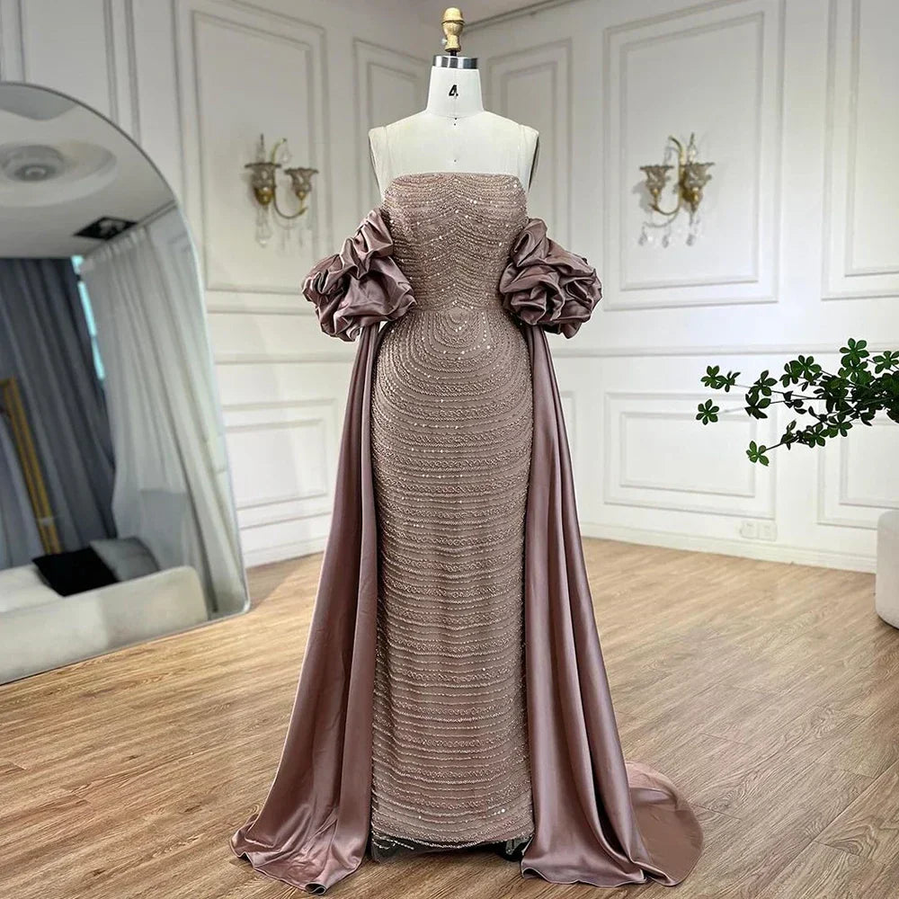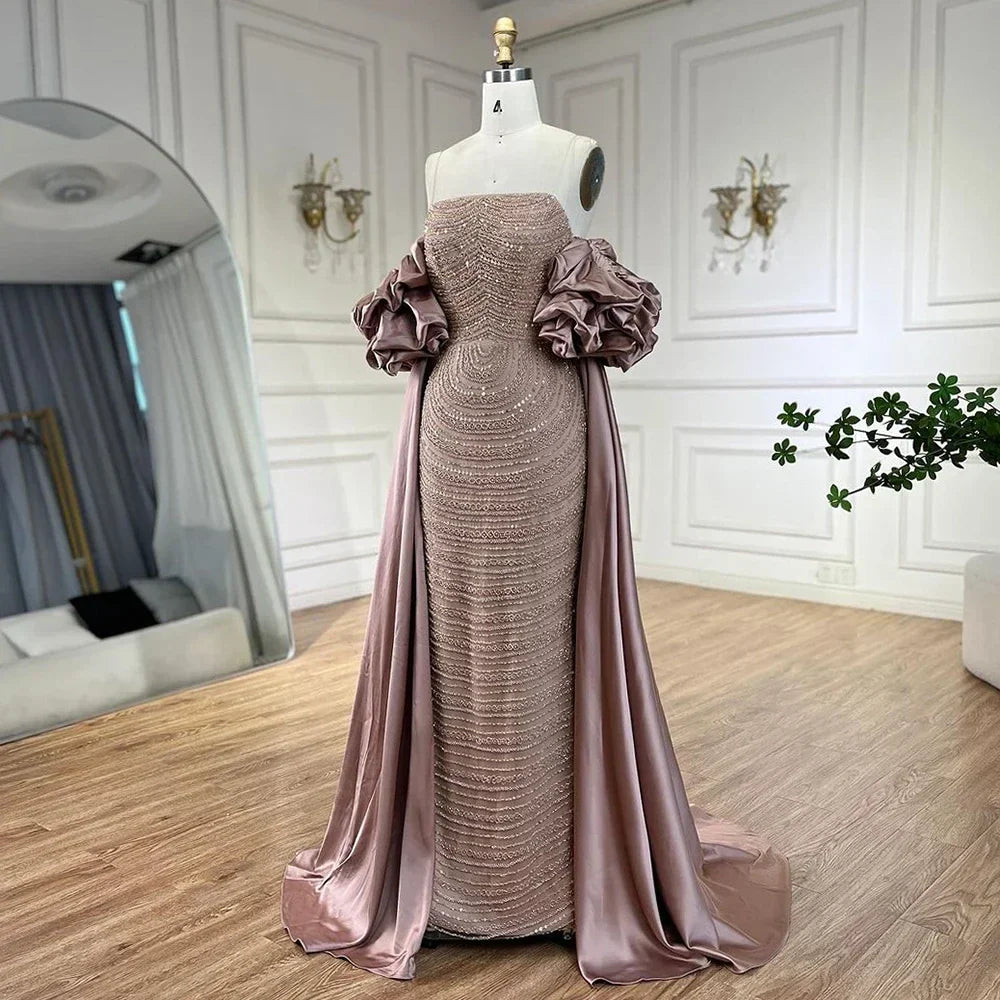 Luxury Arabic Dusty Rose Evening Dresses with Cape Dubai Elegant Strapless Midi Women Wedding Party Gowns LA72543
