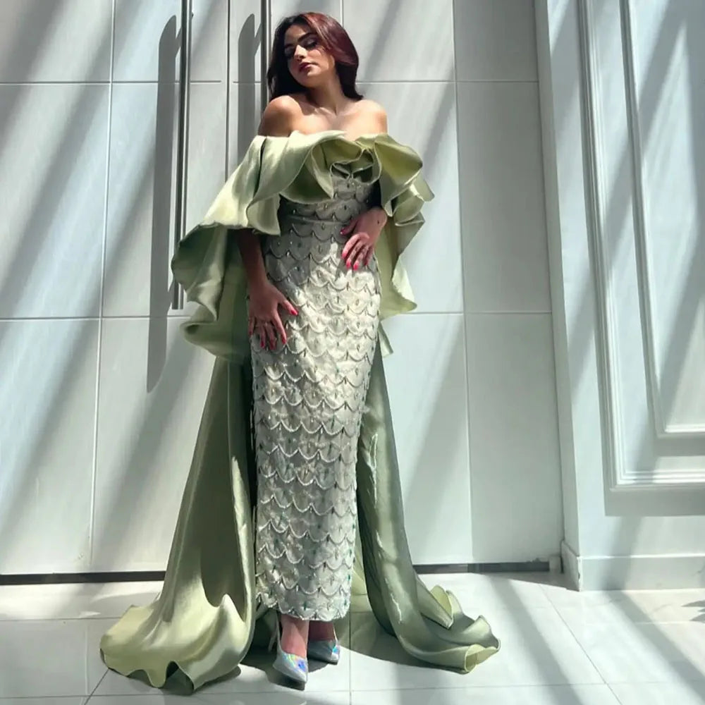 Luxury Dubai Arabia Sage Green Evening Dresses Gowns With Cape Beaded Women Wedding Party Dress 2025 LA72567