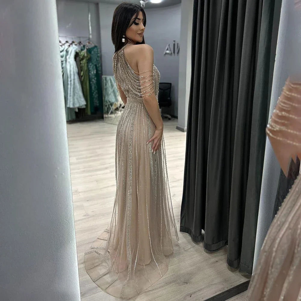 Luxury Dubai Arabic A-Line Gold Beaded Tassel Formal Evening Dresses for Women's Wedding Party Gowns 2025 LA70357