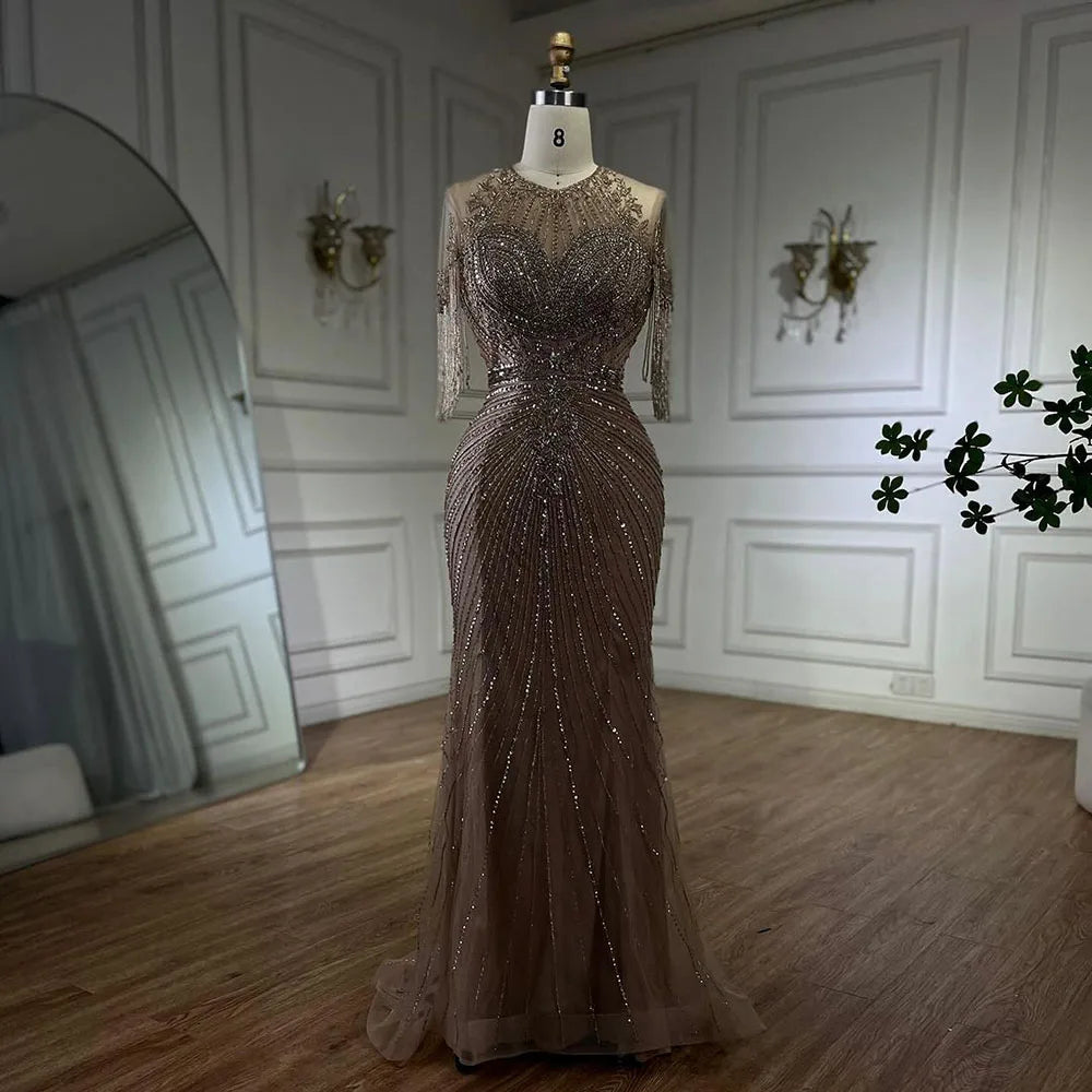 Luxury Dubai Arabic Caramel Tassel Mermaid Beaded Evening Dresses Gowns for Women's Wedding Party 2025 LA72463