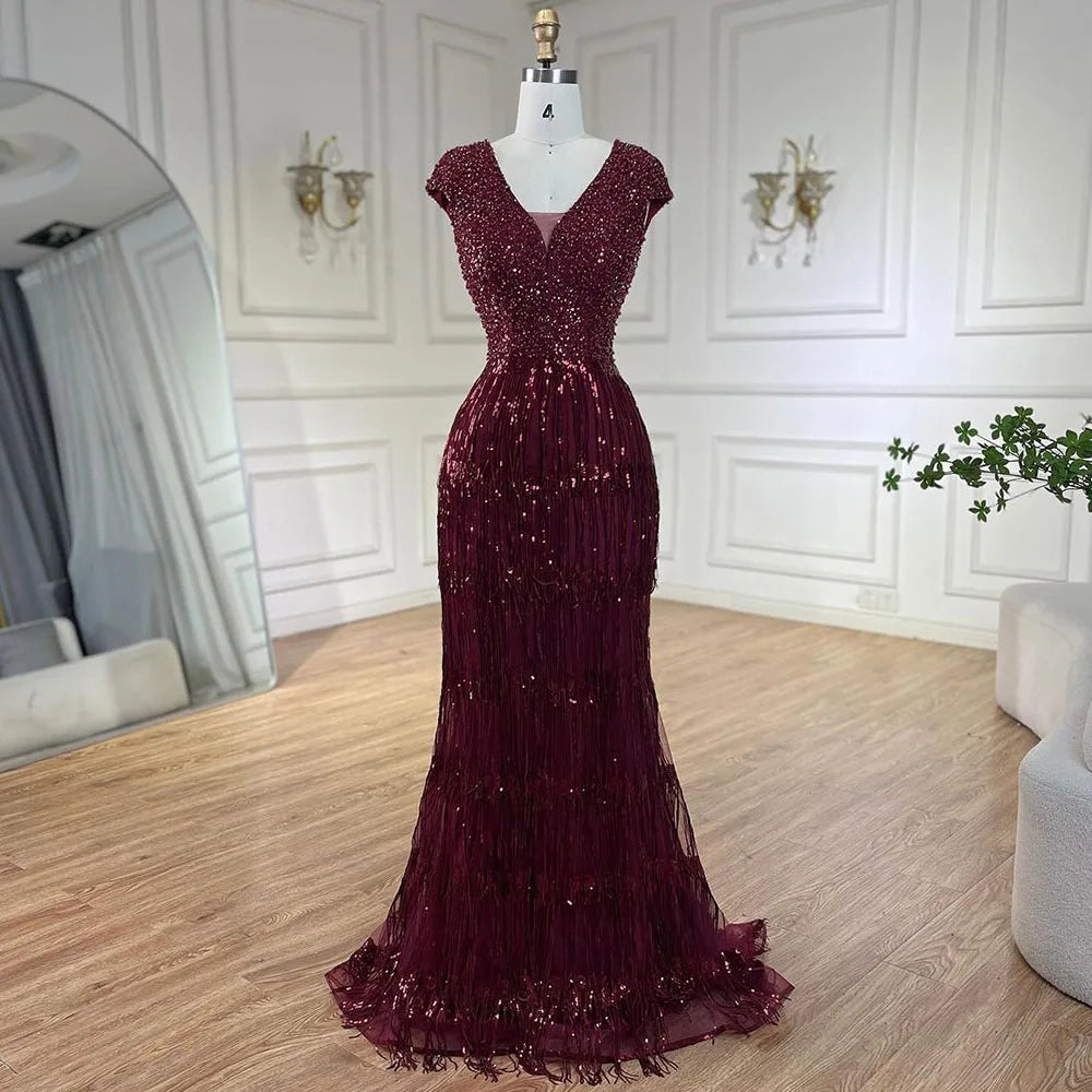 Luxury Dubai Arabic Mermaid Gold Elegant Tassel Beaded Evening Dresses Gowns for Women's Wedding Party 2025 LA72581