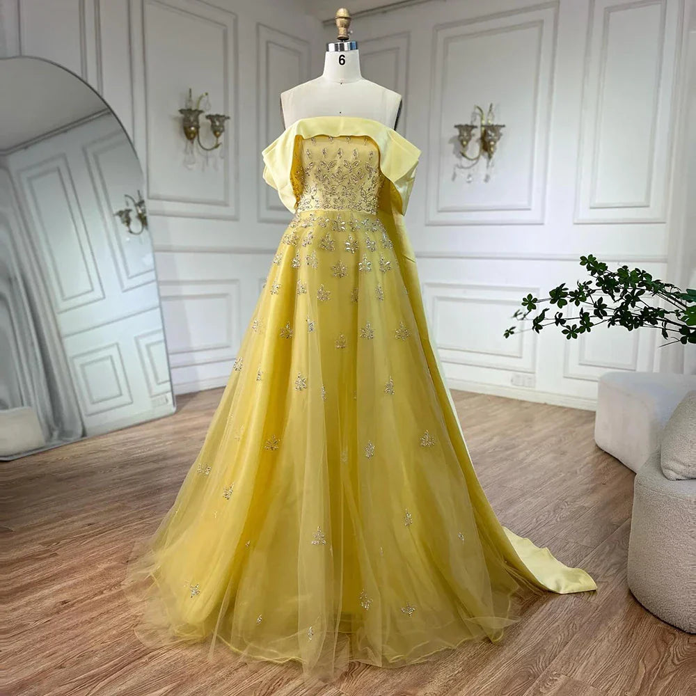Luxury Dubai Arabic Yellow Elegant Boat Neck Long Evening Dress Beaded Party Gown for Women's Wedding LA72531