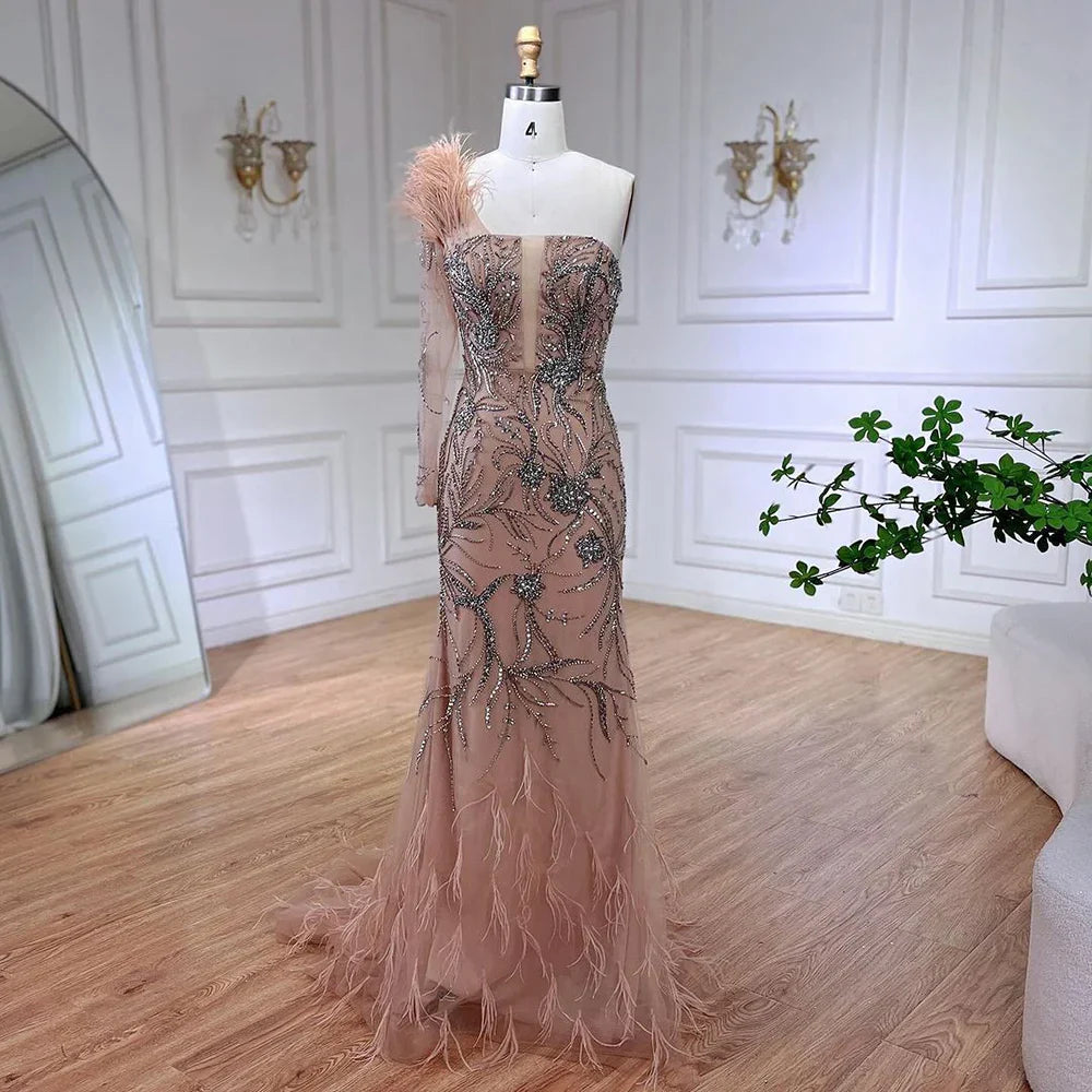 Luxury Dubai Nude One Shoulder Beaded Feathers Mermaid Evening Dresses Gowns for Women Wedding Party Gown LA72508