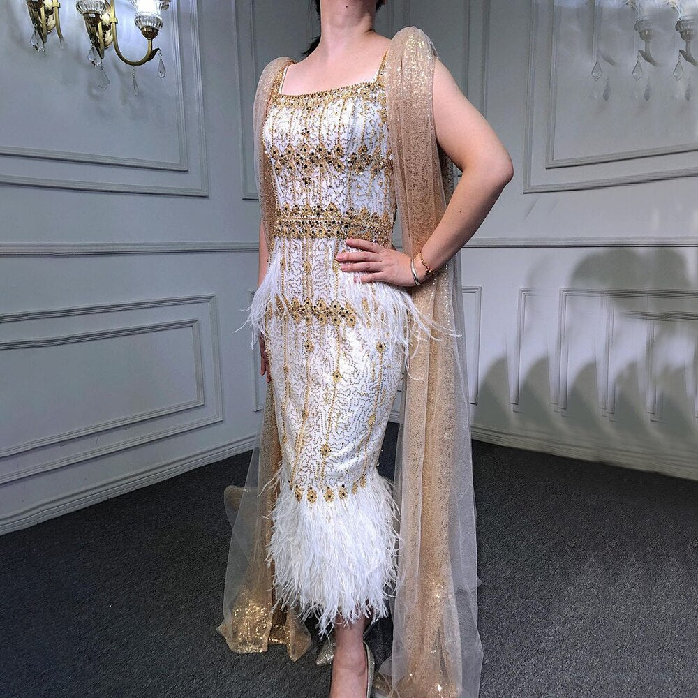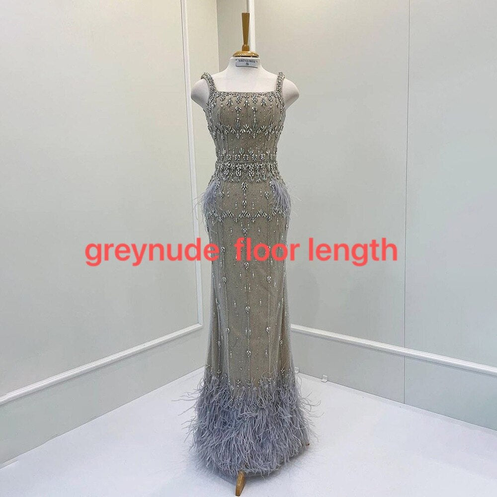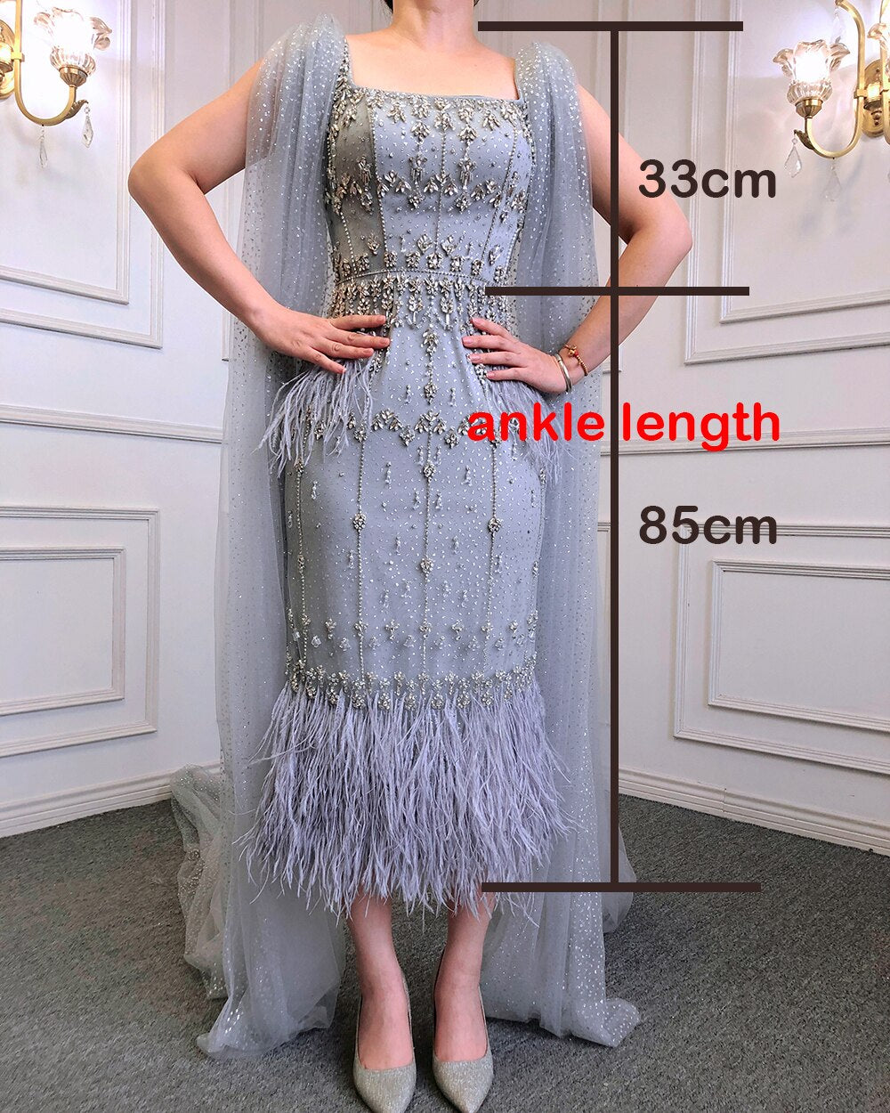 This luxurious gown features a stunning cape adorned with feathers. perfect for adding a touch of glamour to any formal event. The chic gray color and mermaid silhouette will make you stand out from the crowd. Perfect for weddings. parties. and any special occasion.