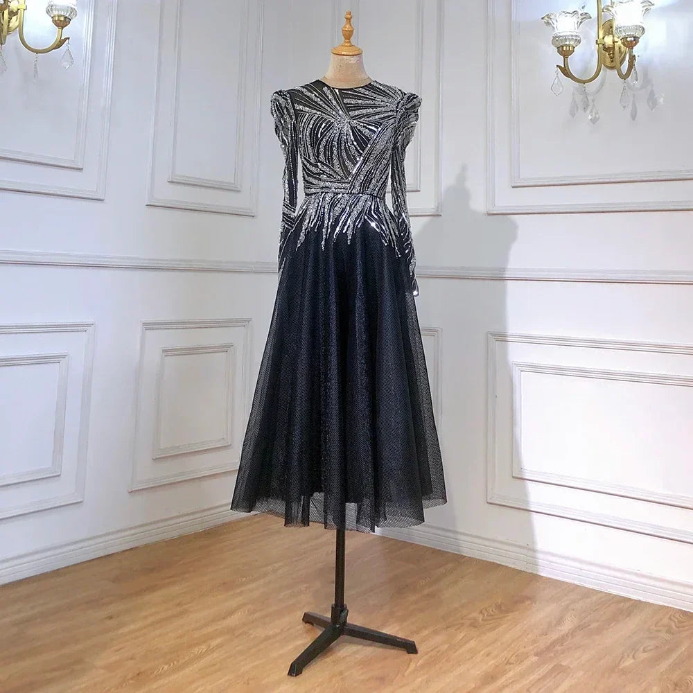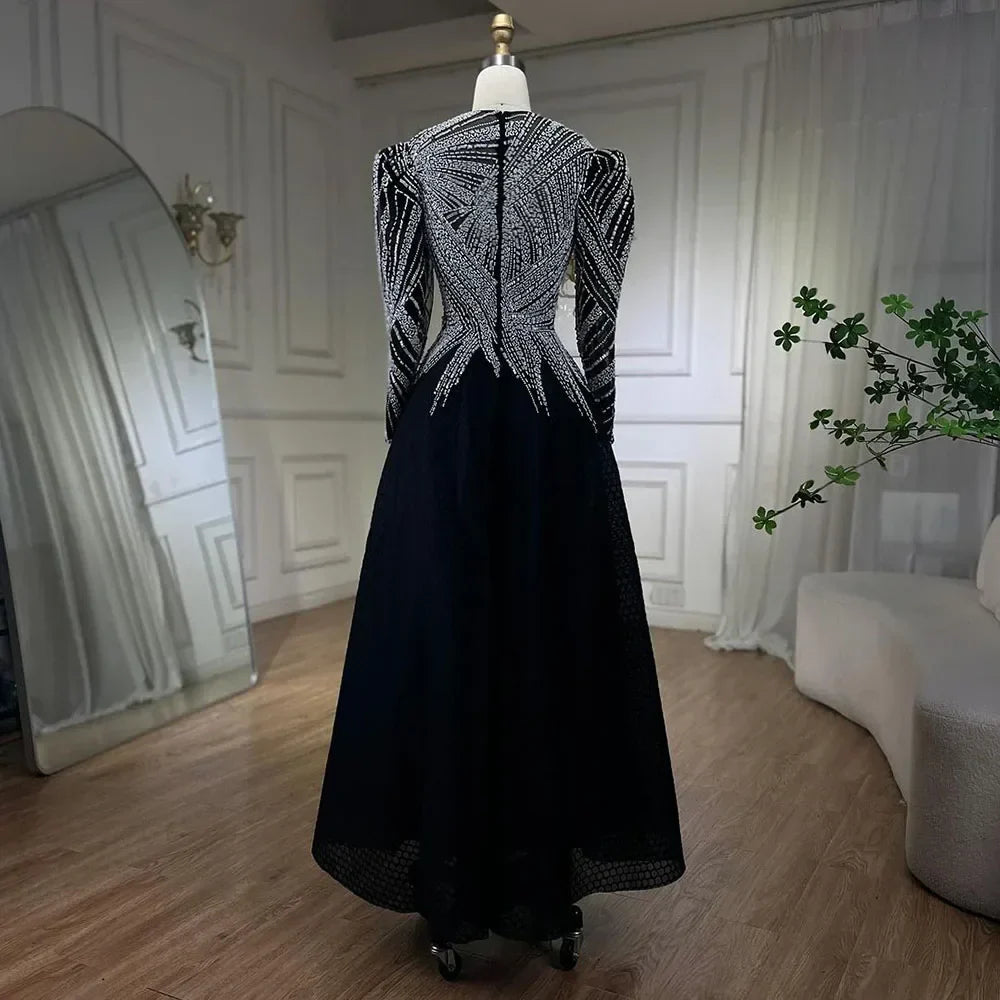 Muslim Black A-Line Midi Luxury Beaded Ankle Length Evening Dresses Gowns 2025 For Women Party LA71290