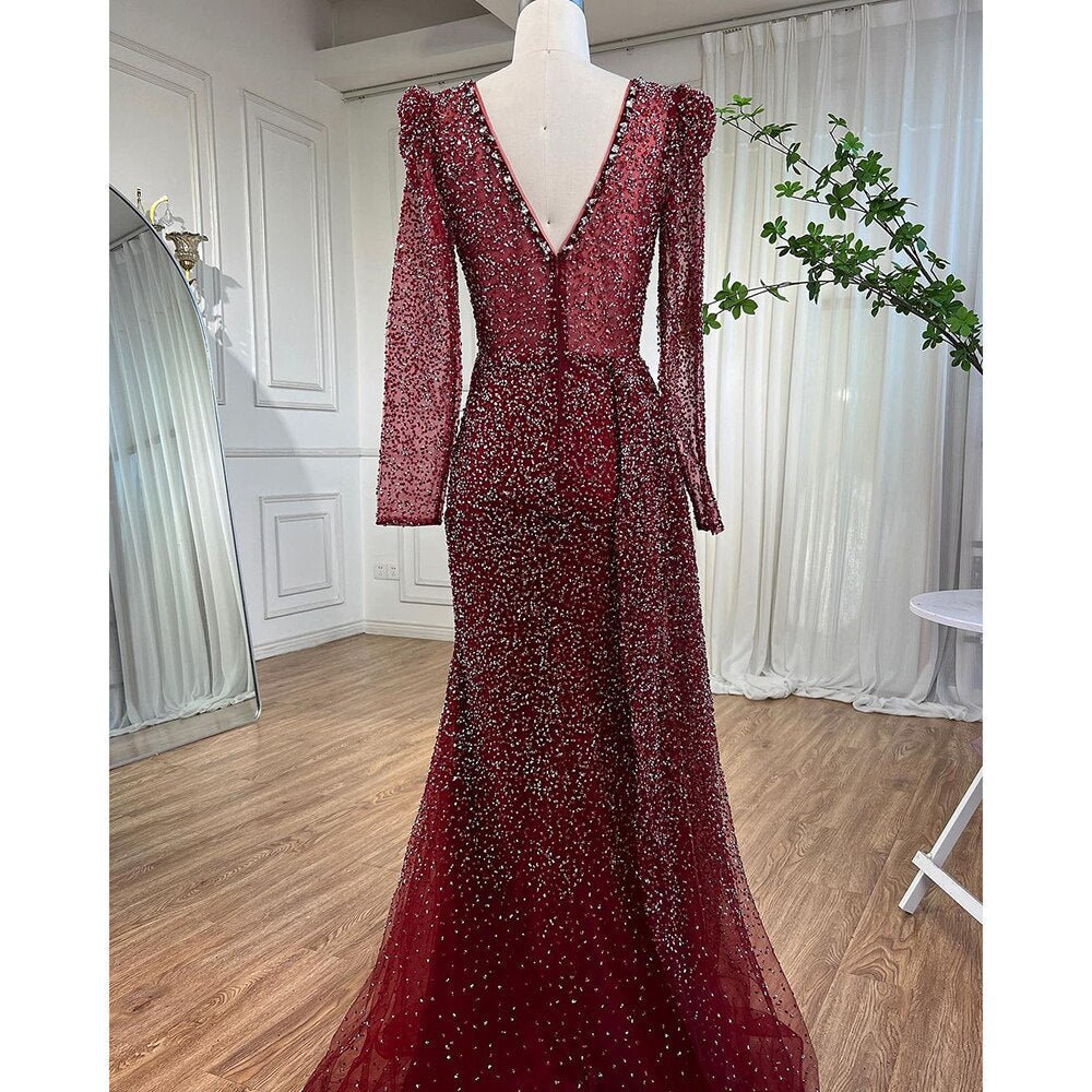 Muslim Designer Luxury Wine Red Mermaid V Neck Beaded Evening Dresses Gowns For Women Wedding Party 2025 LA72148