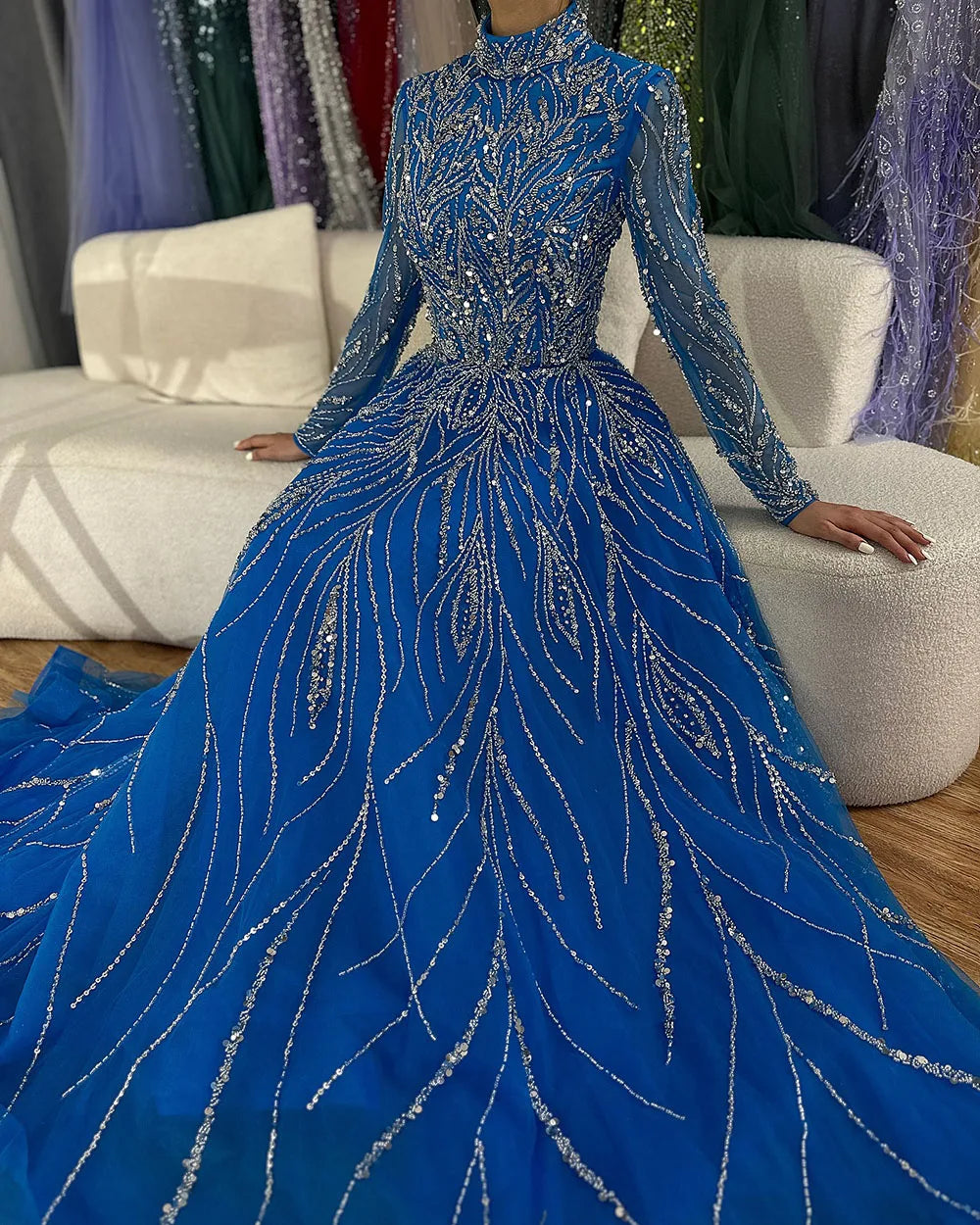 Muslim Elegant blue A Line Beaded Luxury Dubai Evening Dresses Gowns For Women Wedding Party 2025 LA72302A