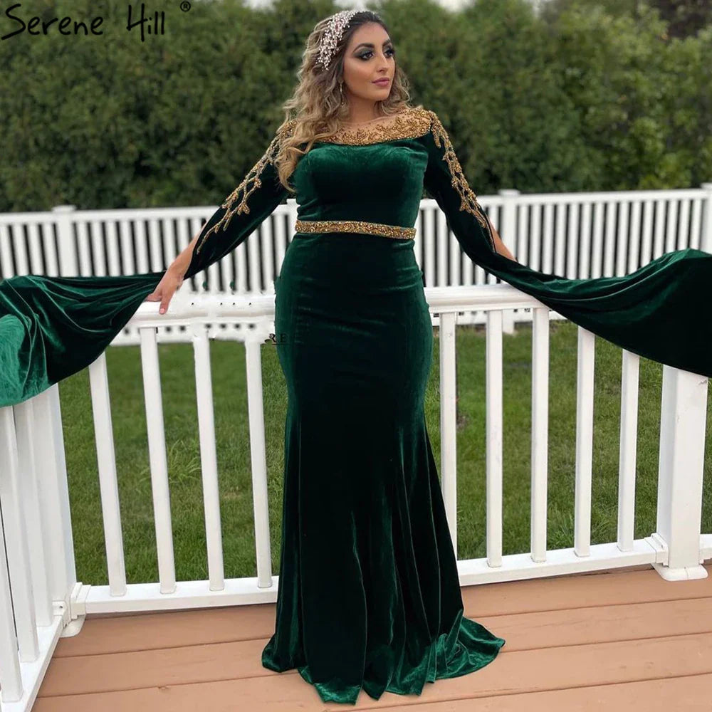 Muslim Green Cape Sleeves Evening Dresses Gowns 2025 Beaded Elegant Mermaid Velour for Women Party LA71452
