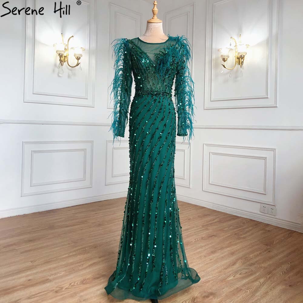 Muslim Green Feather Beaded Evening Dresses Gowns 2025 Mermaid Luxury Elegant For Women Party LA71406